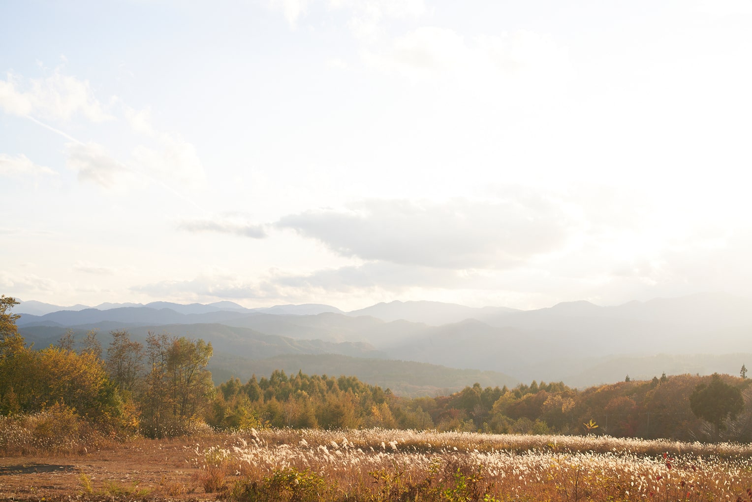 本当は津軽岩木スカイラインをドライブしたかったけれど、日暮れまで時間がない。視界が開けたところまで来て、車を停めて振り返る。黄金色に輝くススキの野原の向こうに、夕日に照らされた白神山地の山々が見えた。幾重にも折り重なった山は大海の波のようにも見える。