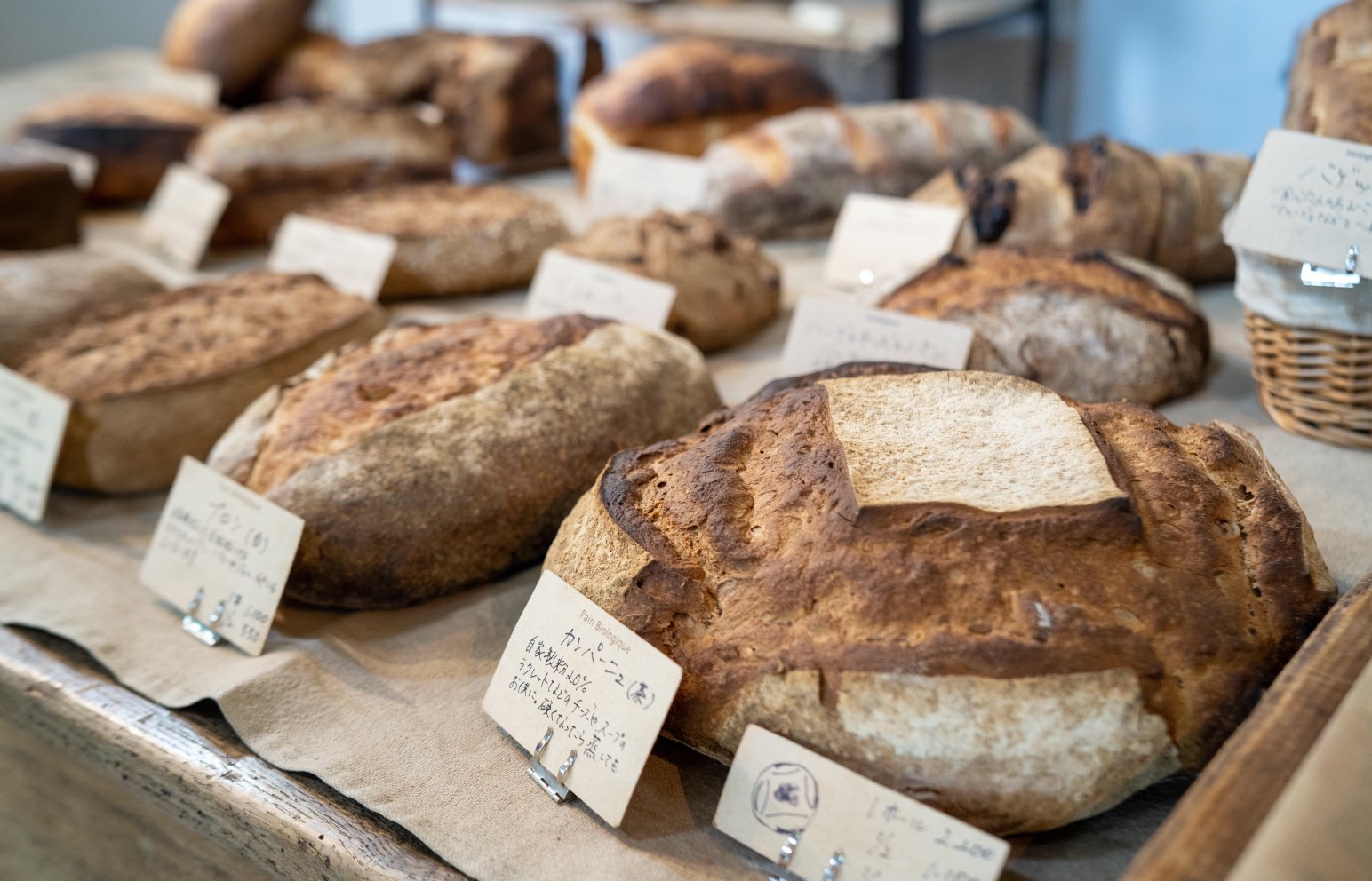 「中川農場」や、「オフイビラ農場」など、地元十勝のオーガニックの小麦を自家製粉し、自家培養したルヴァン種で醸し、薪窯で焼き上げる。