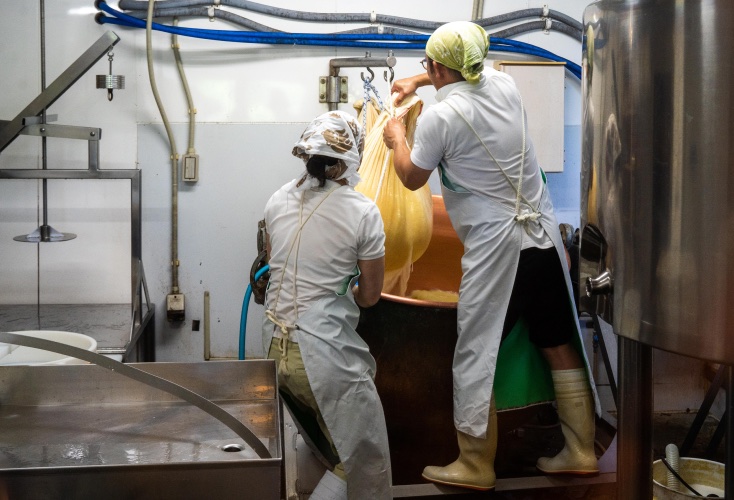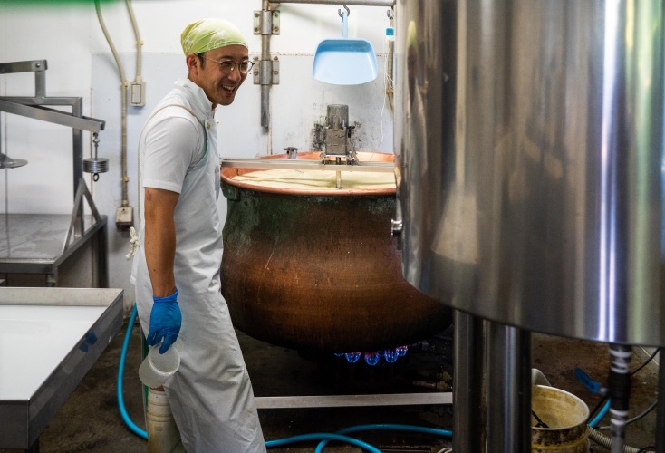 カタネベーカリー一行が訪れたとき、ちょうど本間幸雄さんはチーズ作りの真っ最中。