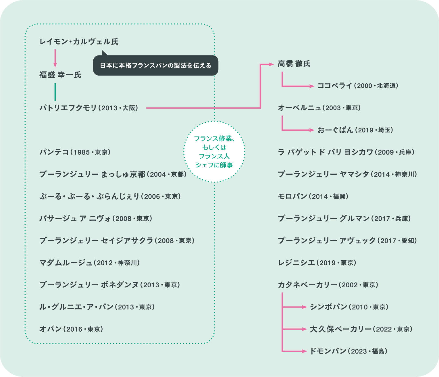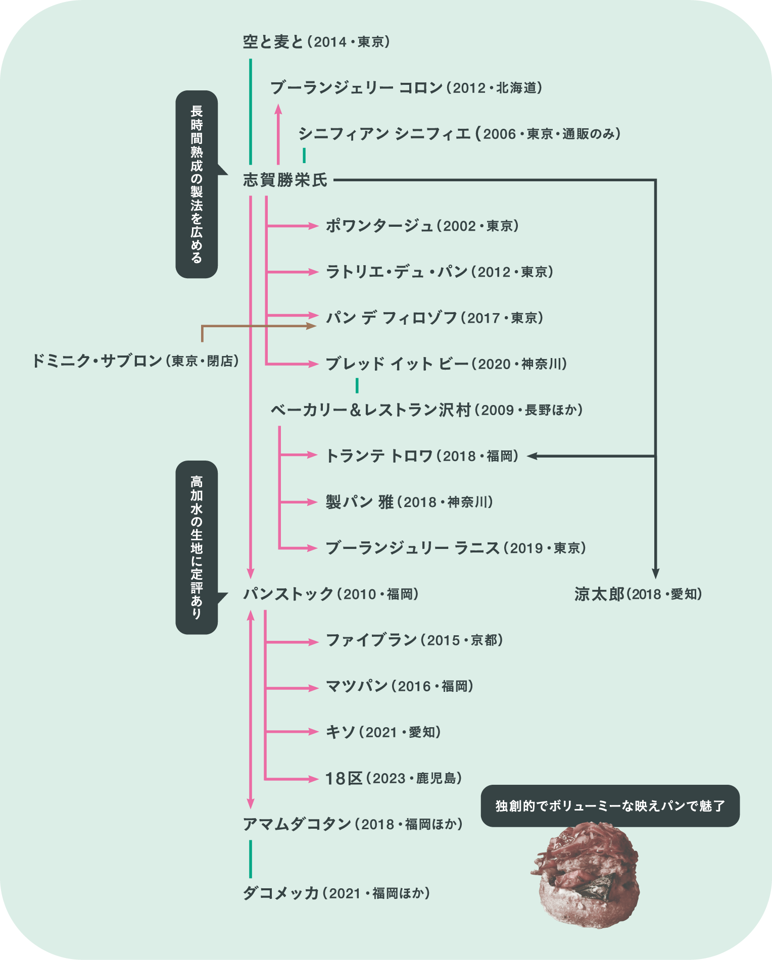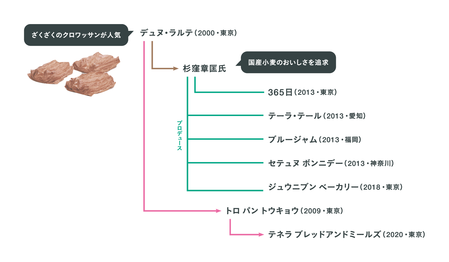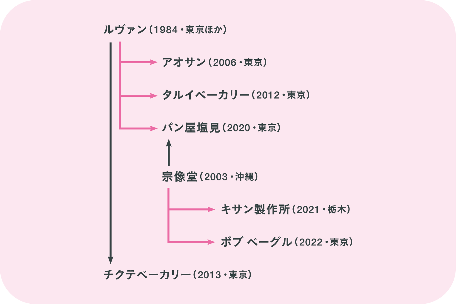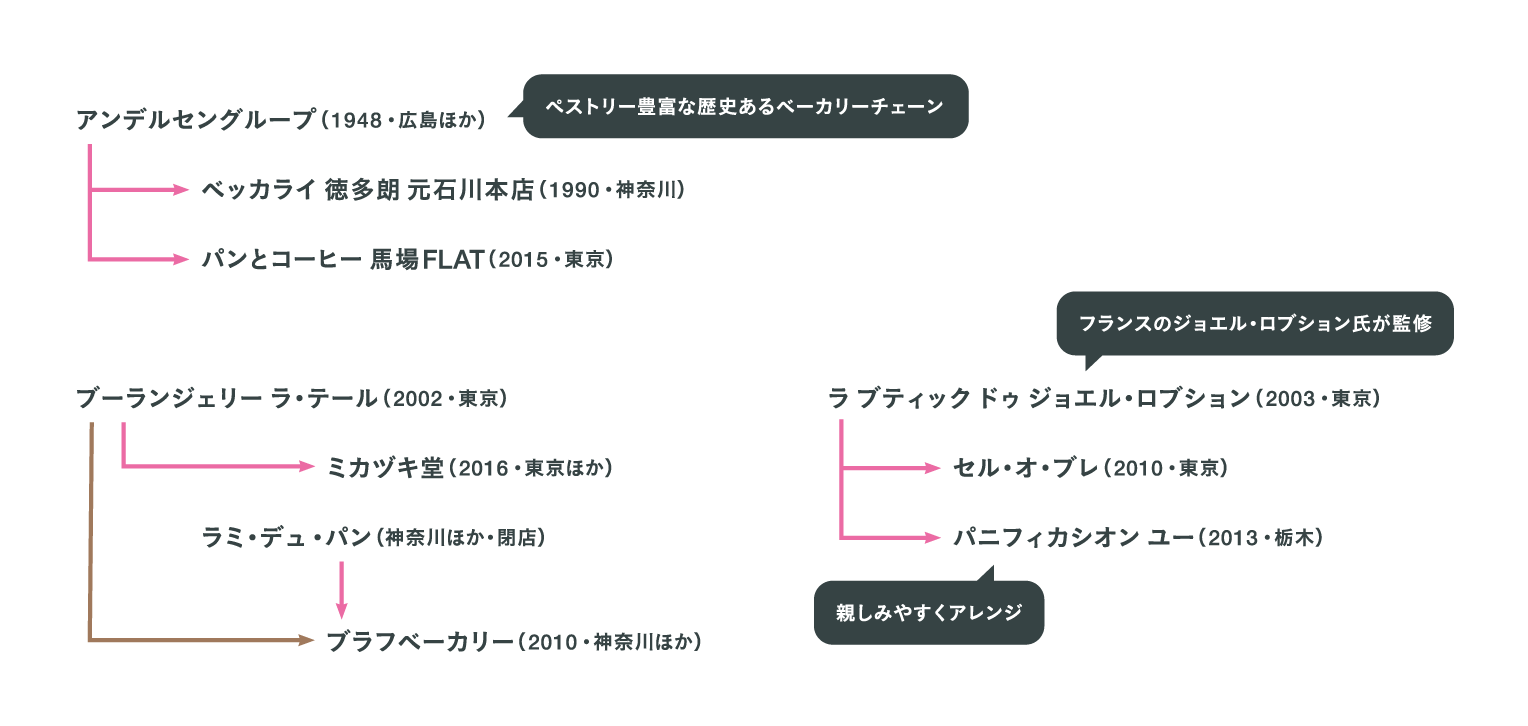 日本でパン職人になるには、まずはどこかの店で修業してから独立するのが一般的。そのため、修業先の哲学は弟子に受け継がれるわけだが、必ずしもそのスタイル・味をそっくり継承せず、その職人独自の考えで新たな味が生まれることも多い。一つの店だけでなく複数の店を経験してから独立している職人も少なくない。そうしていくつもの流派が生まれ、独特な日本のパン食文化が花開いたのだ。「パン屋さん」という言葉の裏には、歴史の連なりや職人たちの努力、そしてさらに豊かな未来がある。パンの名店の系譜は、これからも広がりつづける。