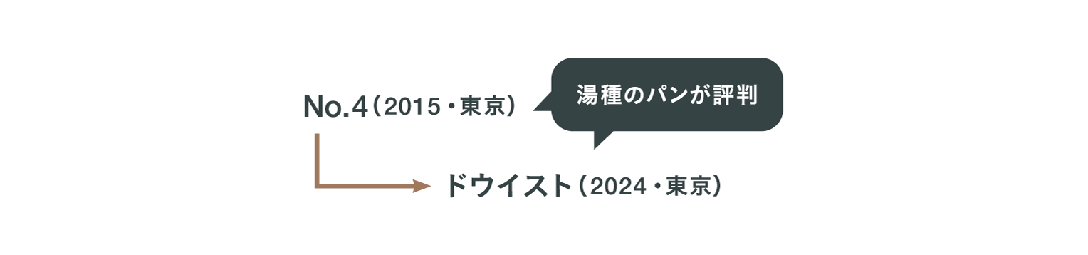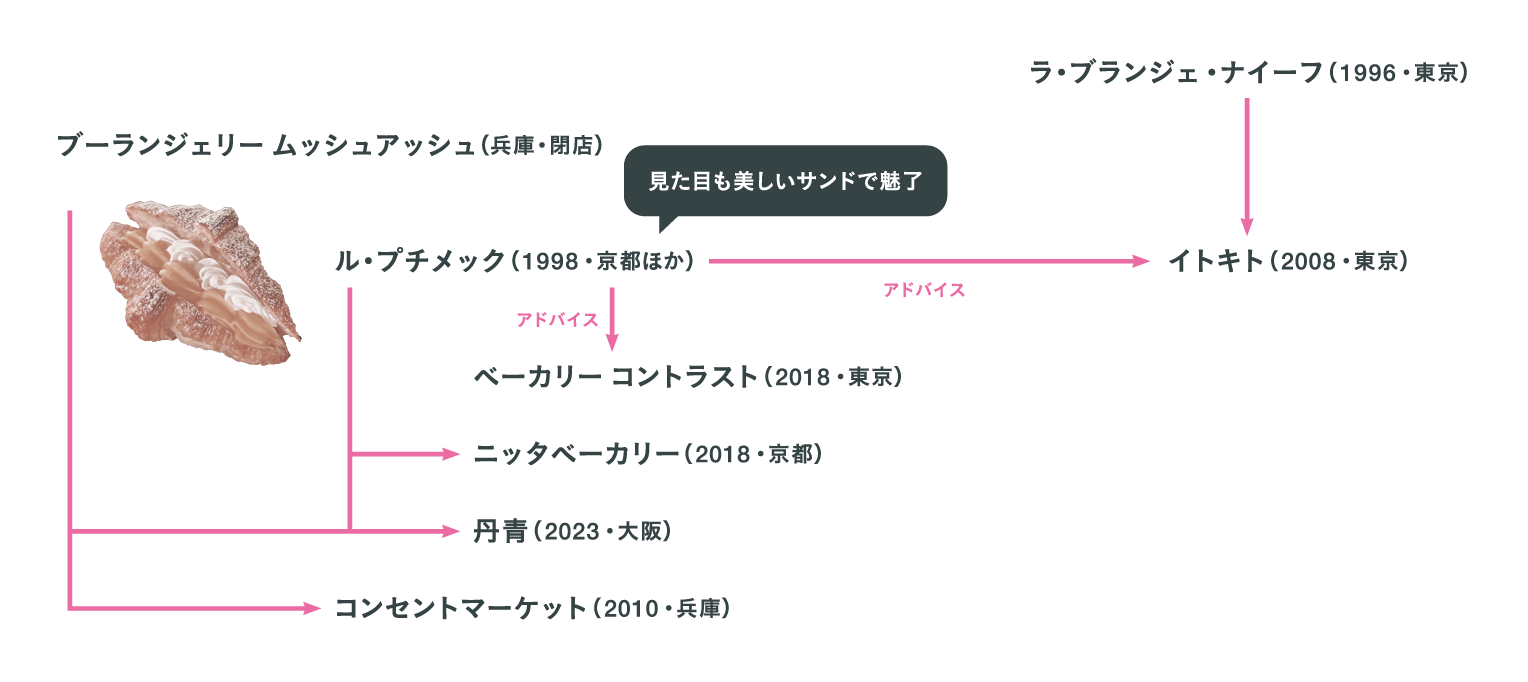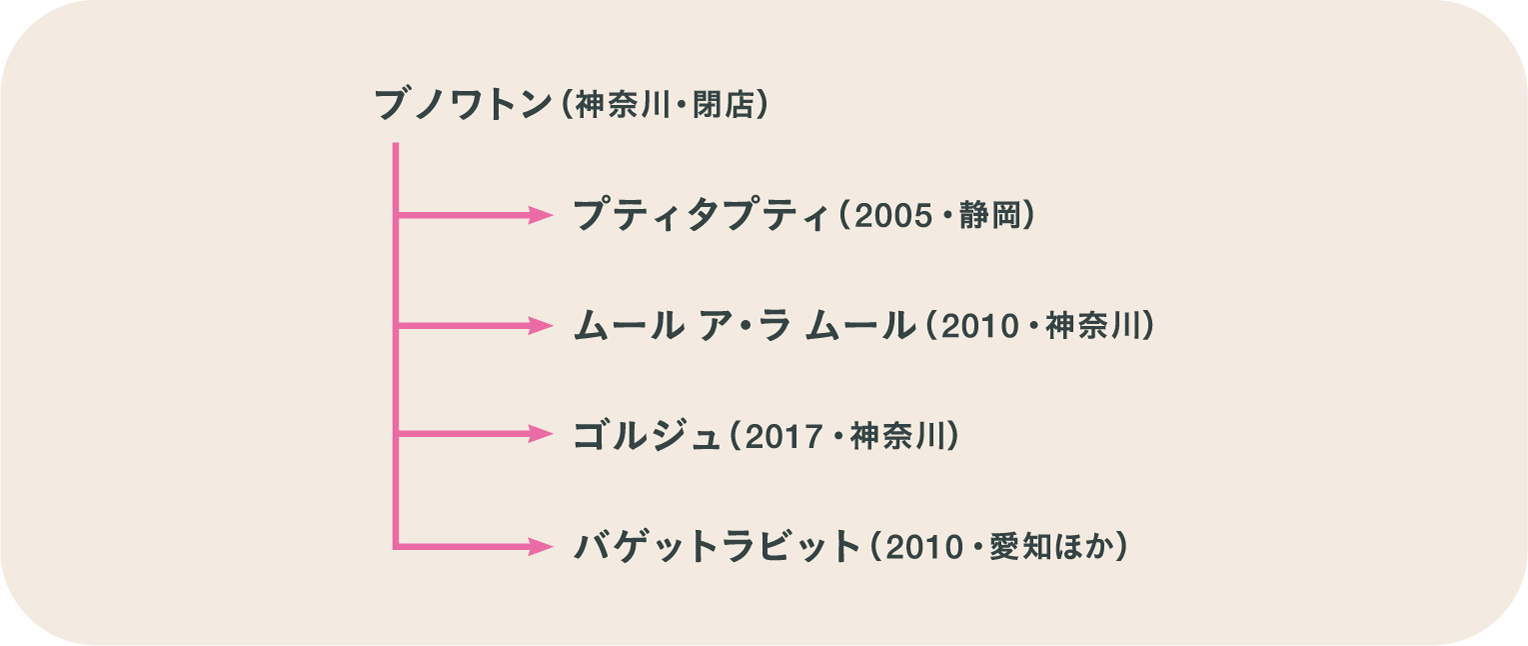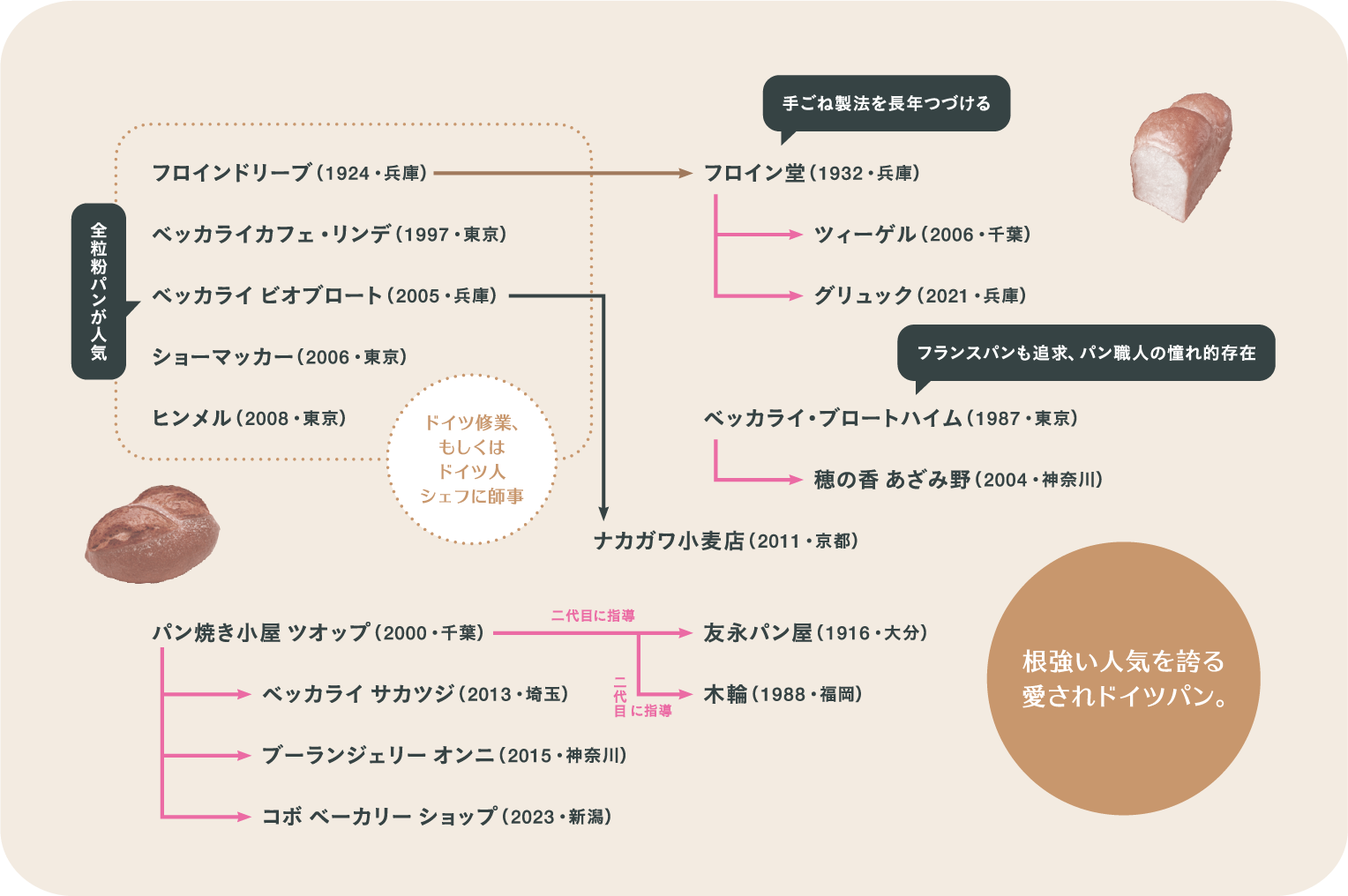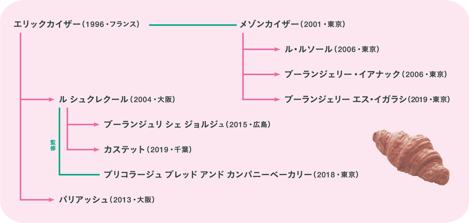 日本でパン職人になるには、まずはどこかの店で修業してから独立するのが一般的。そのため、修業先の哲学は弟子に受け継がれるわけだが、必ずしもそのスタイル・味をそっくり継承せず、その職人独自の考えで新たな味が生まれることも多い。一つの店だけでなく複数の店を経験してから独立している職人も少なくない。そうしていくつもの流派が生まれ、独特な日本のパン食文化が花開いたのだ。「パン屋さん」という言葉の裏には、歴史の連なりや職人たちの努力、そしてさらに豊かな未来がある。パンの名店の系譜は、これからも広がりつづける。