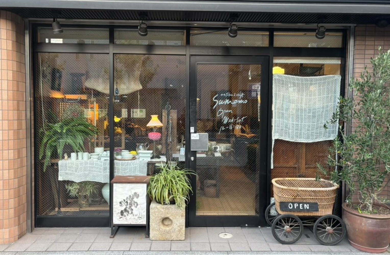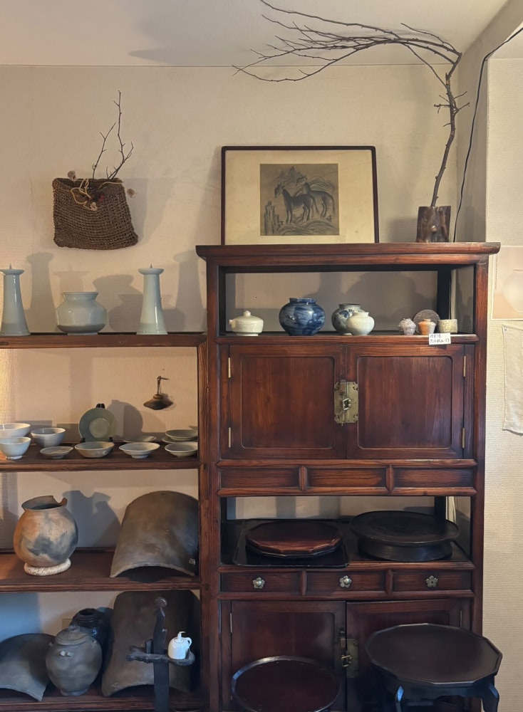 〈ギャラリーすもも〉は、京都の出町柳近くの住宅地にある、喫茶兼ギャラリー。李朝や韓国、日本、ヨーロッパを中心とした工芸品などを扱っていて、店内には韓国や朝鮮の家具、アンティークの陶器、マッコリ用のお椀など、手仕事の息づかいが感じられる品々が揃っている。