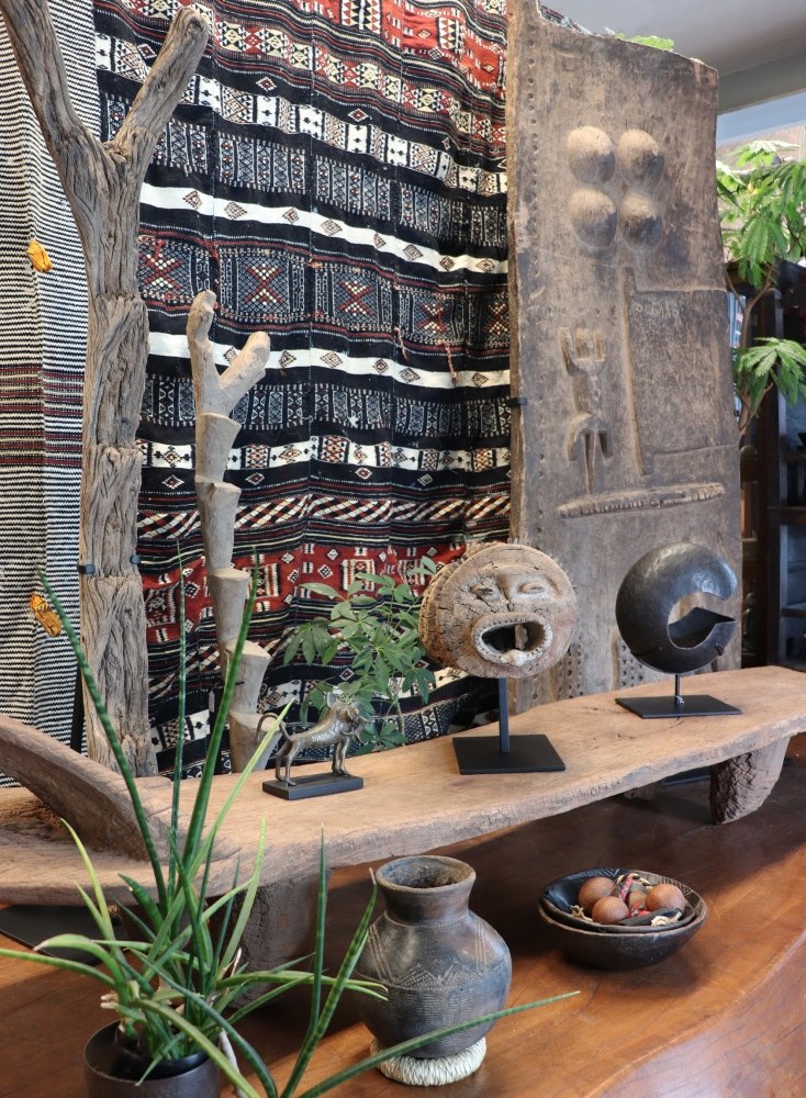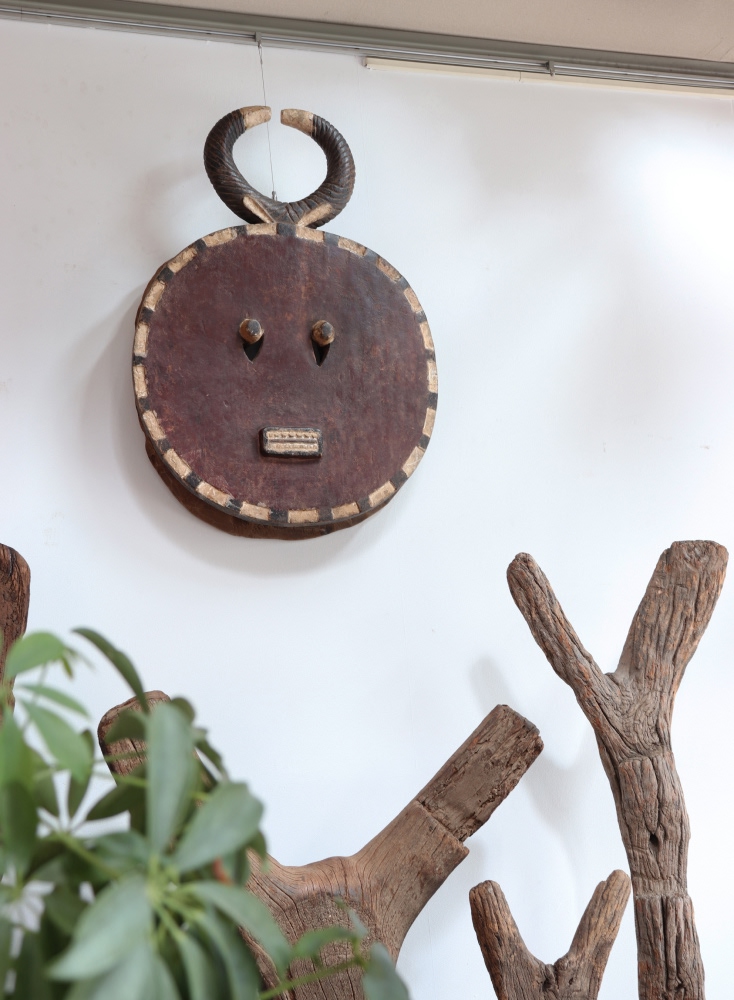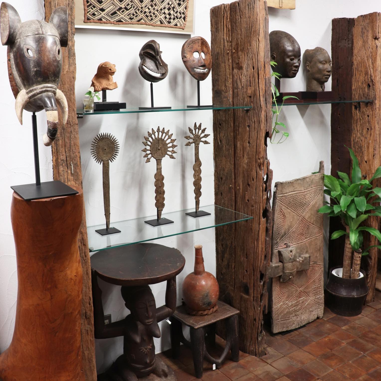〈ギャラリーかんかん本店〉では、アフリカンアートを中心に、仮面や神像、椅子や木器、貨幣といった民具、テキスタイルなどの品々が揃うほか、用途がわからない不思議な道具など、思いがけない発見に出合えるのも魅力のひとつ。