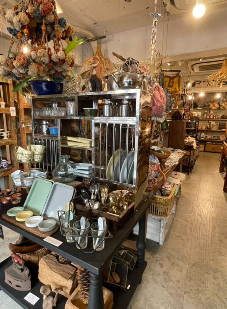 インテリアや食器、そして二度と出会えないかもしれない個性的なお面や器など、アジアの雑貨から世界各地の民藝まで多彩な品々が広がっている。ここに辿り着くまでの背景や土地の物語に想いを馳せながら、目の前の一品と向きあうひとときは、まるで小さな旅をしているかのような気持ちになるはずだ。