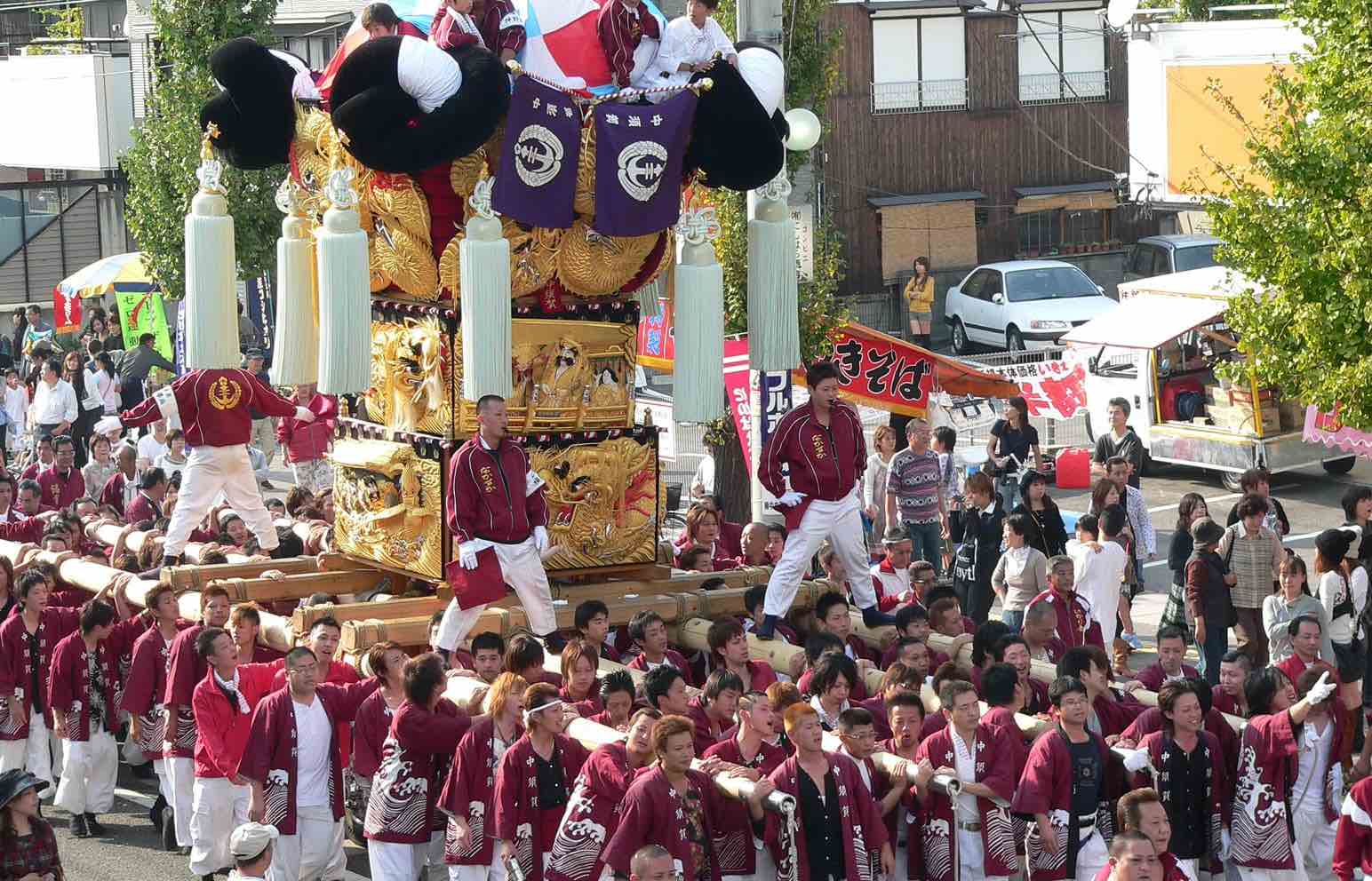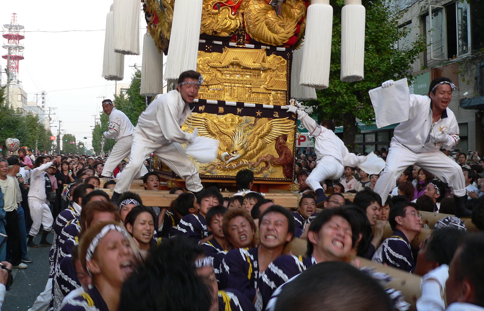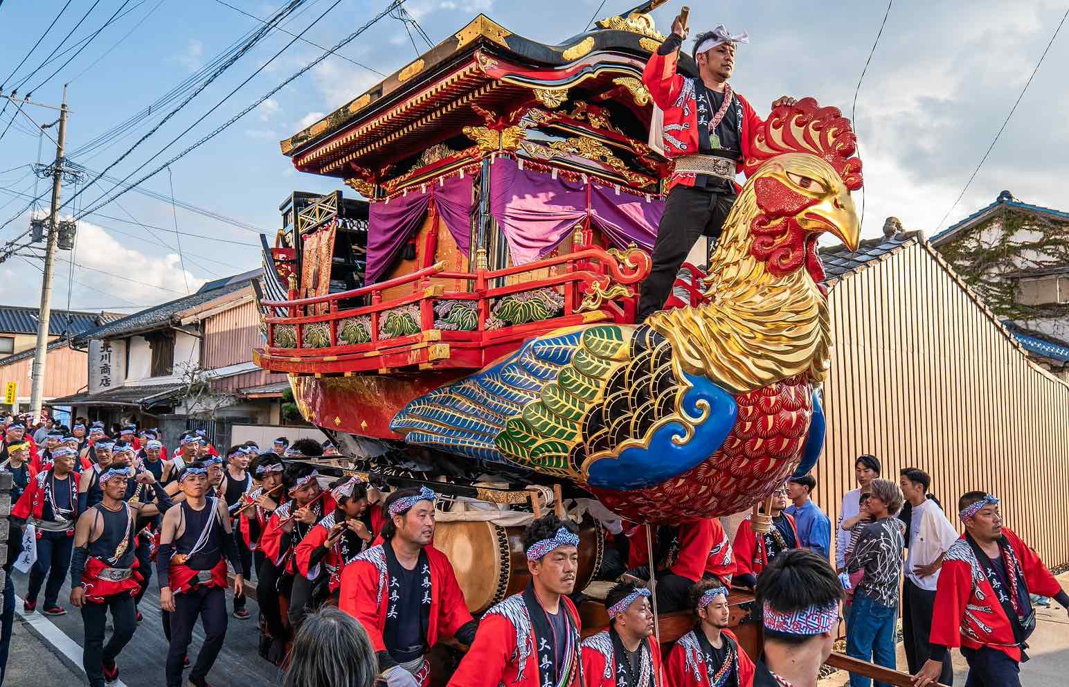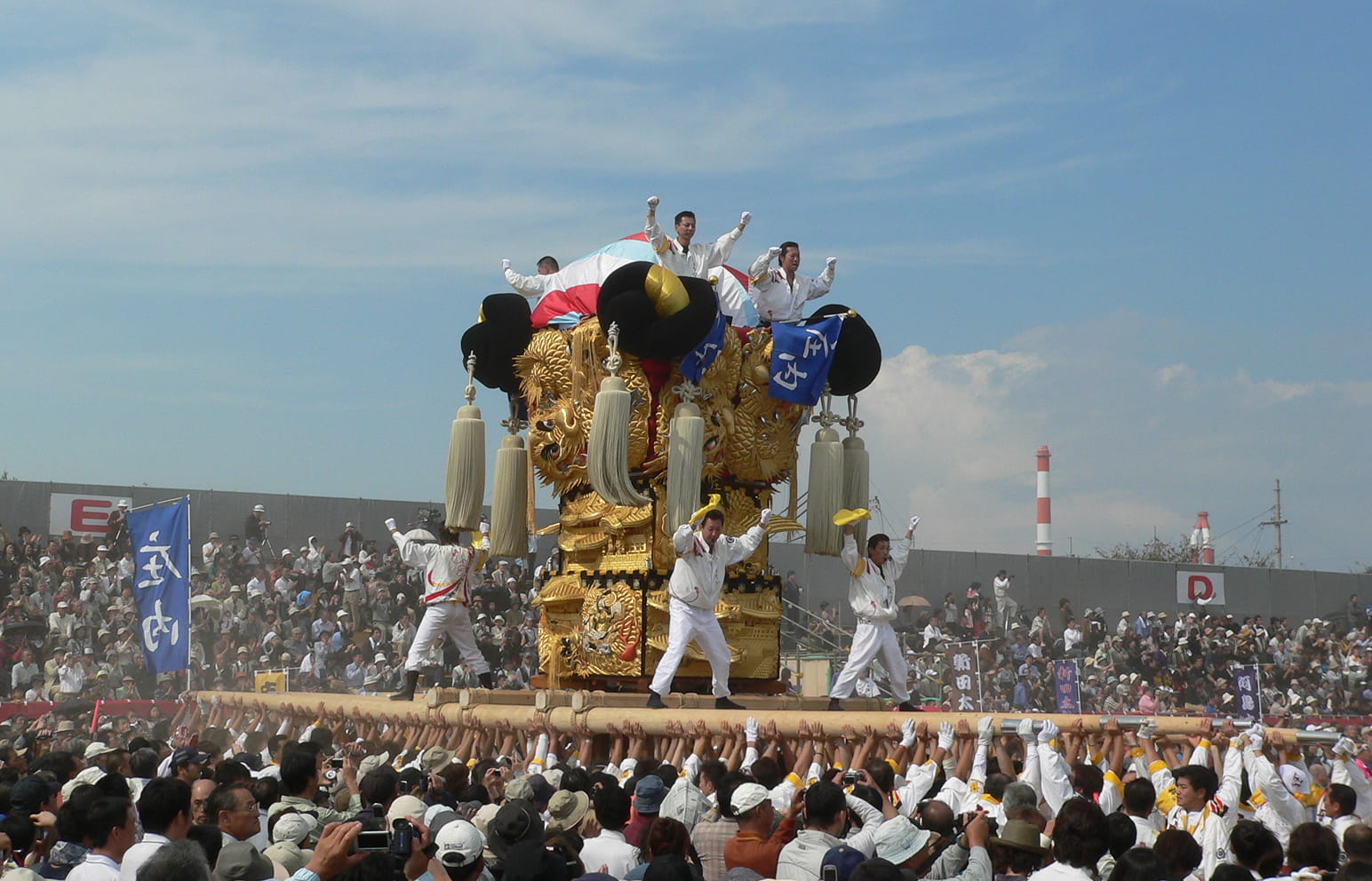 最大の見せ場は、「だんじり」と呼ばれる精巧な彫刻を施した巨大な曳山(ひきやま)を、勢いよく方向転換させる「やりまわし」である。曲がり角には人垣ができ、地鳴りのような歓声とともにだんじりが駆け抜けていく。屋台に施された彫刻も見どころで、停車中には間近で鑑賞できることも。