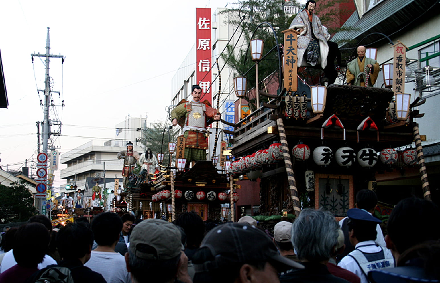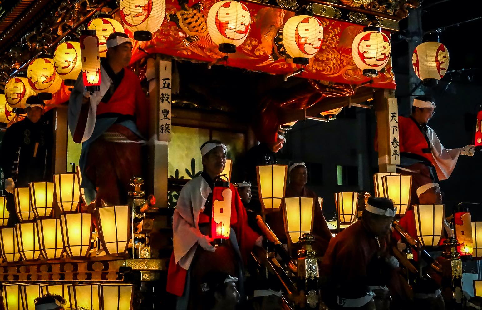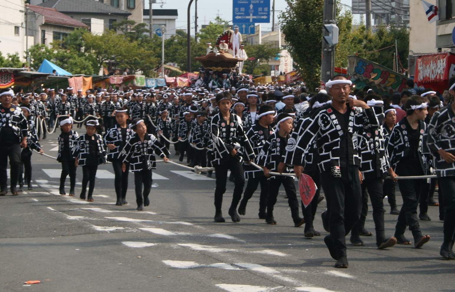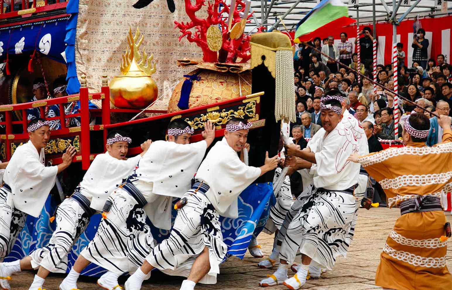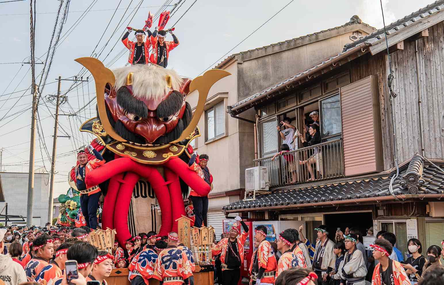 最大の見せ場は、「だんじり」と呼ばれる精巧な彫刻を施した巨大な曳山(ひきやま)を、勢いよく方向転換させる「やりまわし」である。曲がり角には人垣ができ、地鳴りのような歓声とともにだんじりが駆け抜けていく。屋台に施された彫刻も見どころで、停車中には間近で鑑賞できることも。