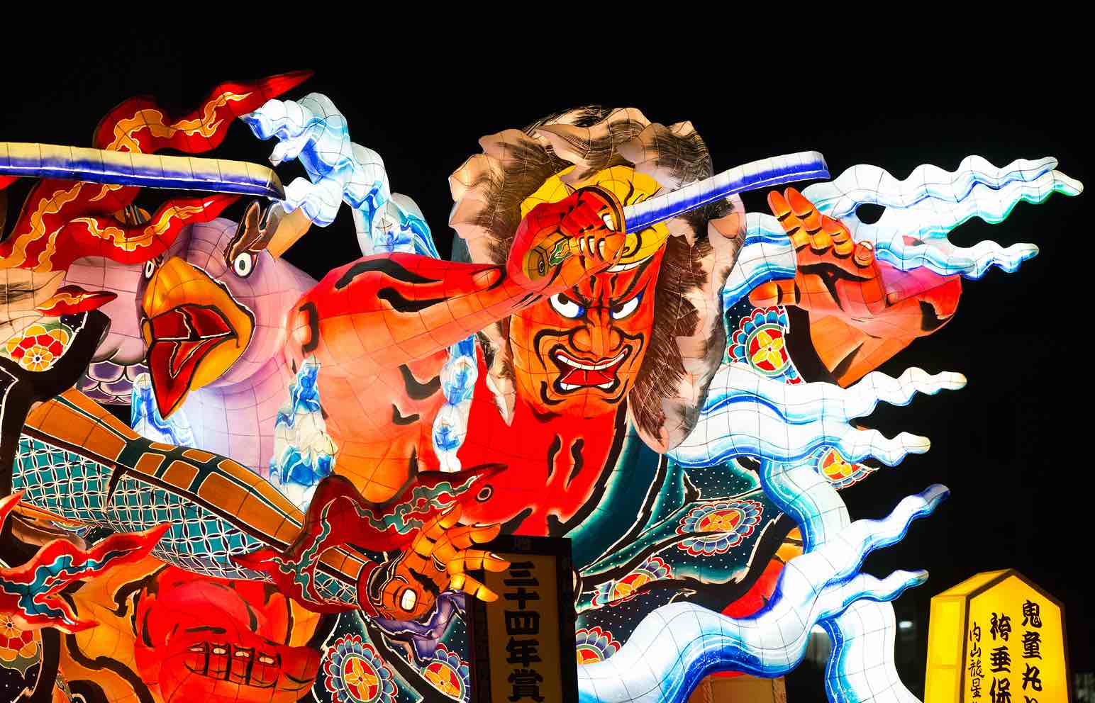 「青森ねぶた祭」は、青森市で行われる東北三大祭りのひとつ。歌舞伎や歴史、神話を題材にした巨大な灯籠「ねぶた」が夜の街を進み、笛や太鼓の囃子に合わせて、「ラッセラー」の掛け声が響き渡る。