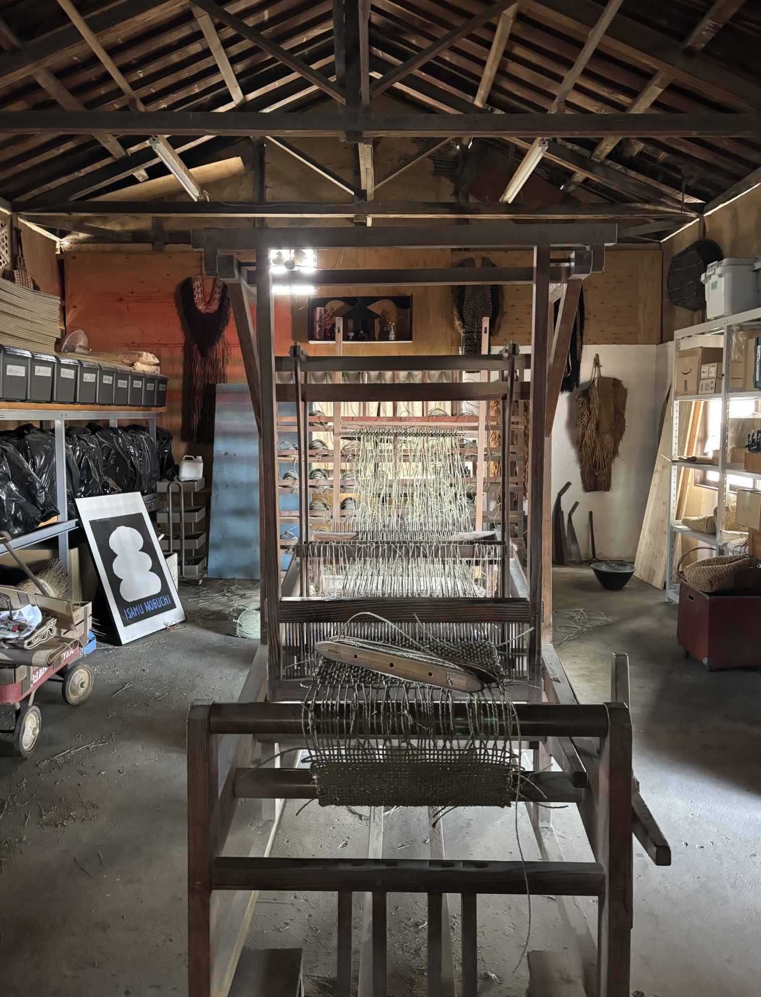家の前には大人ひとりが丸ごと入れそうな水甕が数十と並んできて、工房の中に一歩入ると、仄暗い納屋の中央に巨大なイグサ織り機が鎮座。その機械を囲むように、壁には蓑がいくつもかけられている。