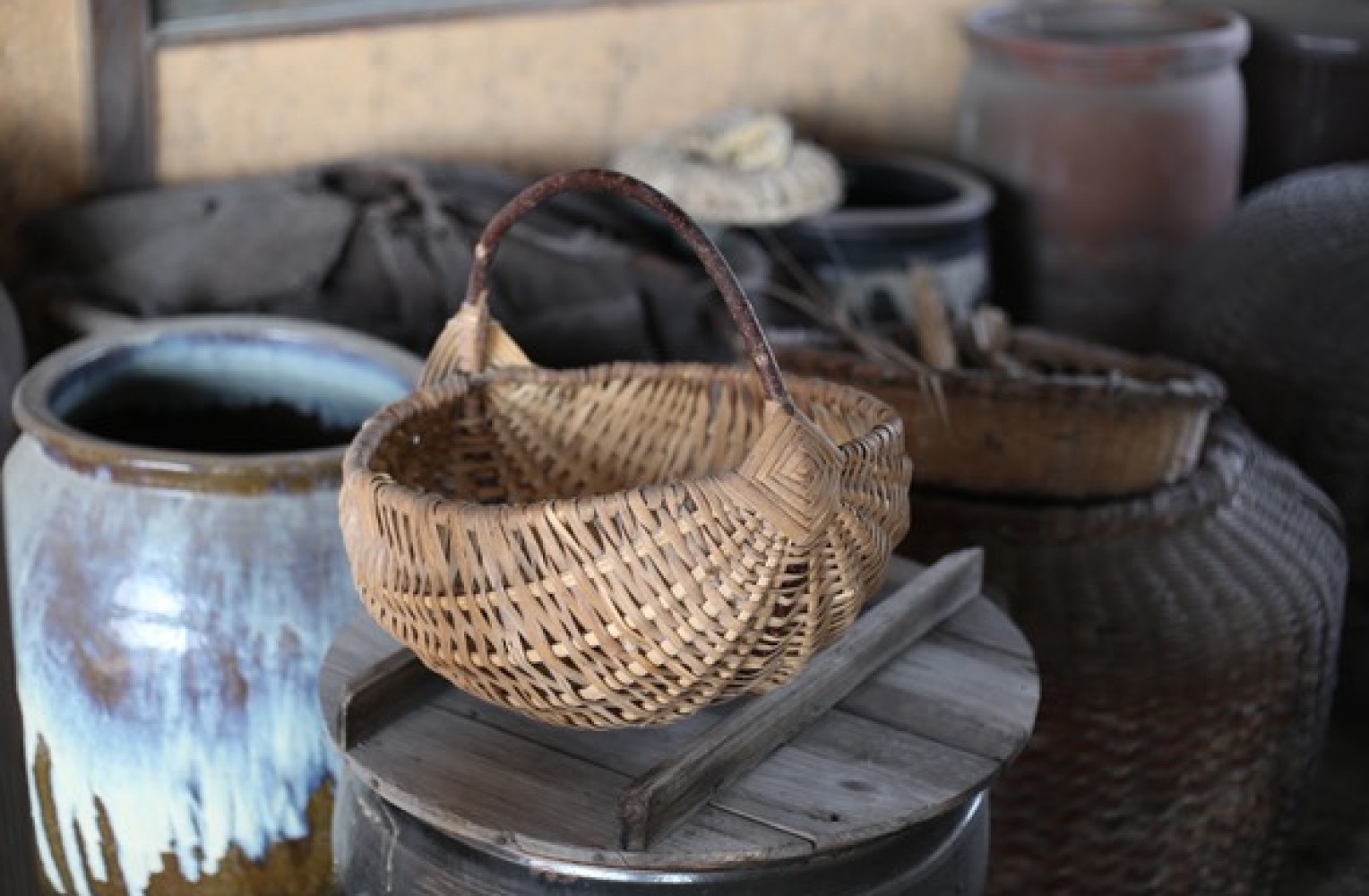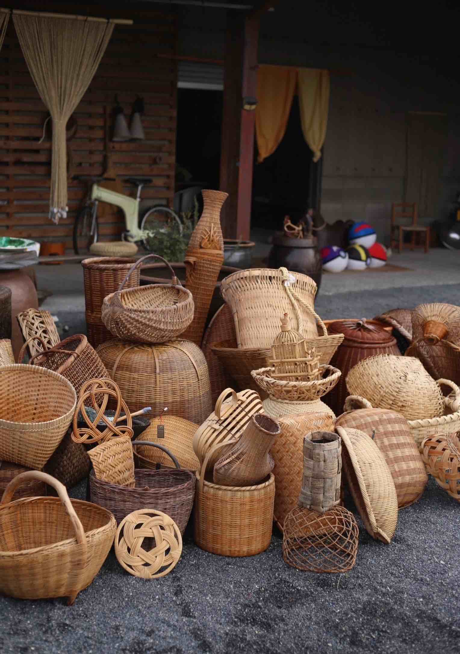 イグサ編みを仕事としてやりはじめた10代の頃から、古道具市や蚤の市に出かけて蒐集するようになりました。編む仕事をしているので、民藝品でいうとカゴ、ゴザなんかに目がいきます。民具の蓑を集めているのも編組品だからですね。
