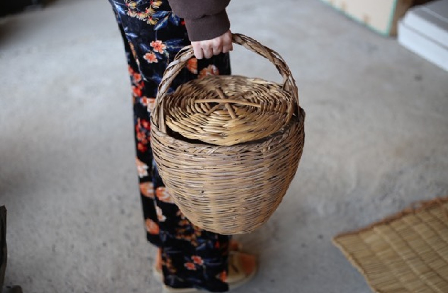 竹のような笹のような、硬めのアシで編まれています。ポルトガルでは、この中にタコを入れて運ぶと聞きました。逃げないように蓋もついているし、アシは水生植物なので水っぽいものを入れても傷みにくいのだと思います。
