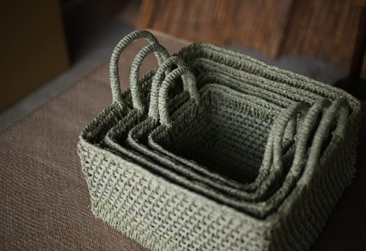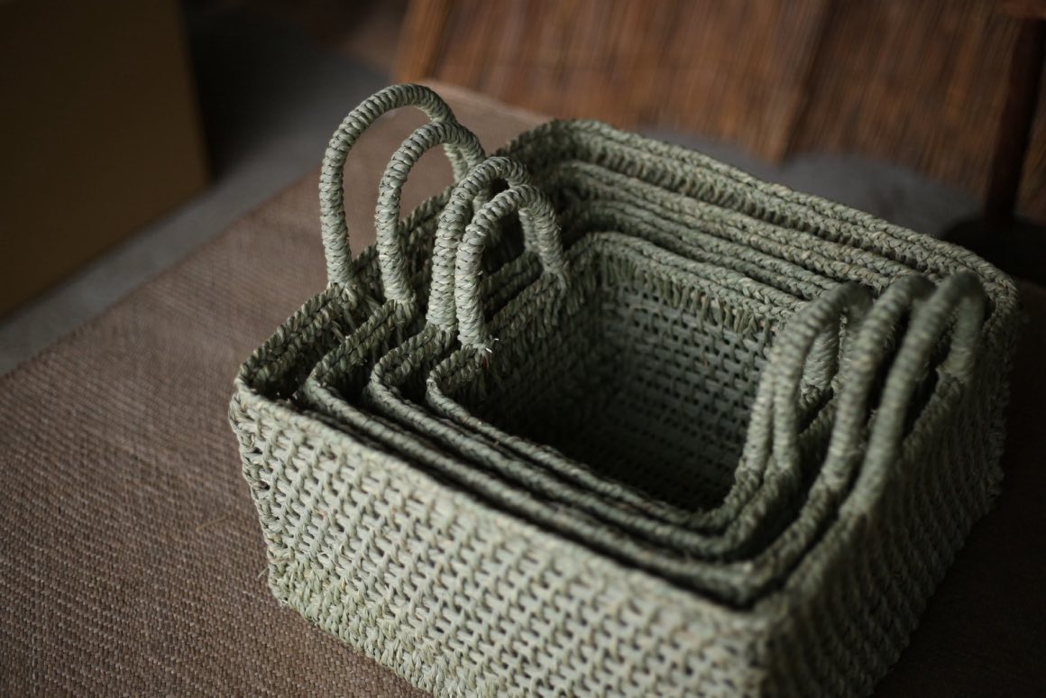 自宅では、イグサの紐の束を入れて使っています。天然素材のカゴって、通気性があっていいんですよね。僕はイグサ編みの作業をするときに、イグサの紐を水で濡らして柔らかくするんですけど、濡れたイグサ紐をプラスチックのカゴに入れると、ムレて傷みやすくなるんですよね。でもこうした植物素材のカゴは、接面からも水分をやさしく吸って吐き出すことができて通気性がいい。カゴも、中に入れたものも、すぐ乾くし、傷みにくいんです。