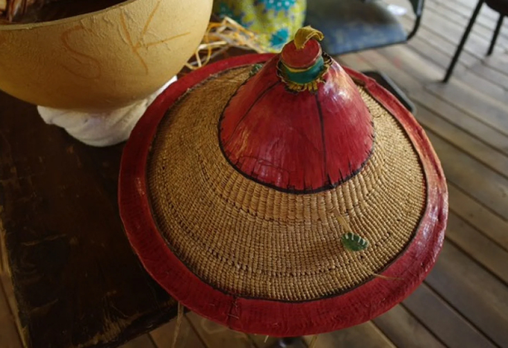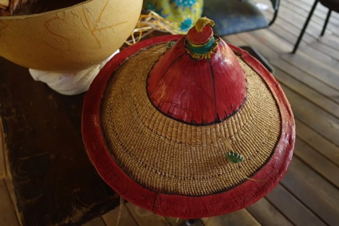 カゴ大会のアフリカからの出店者から買ったものです。ブルキナファソの帽子で同じようなものを見たことがあるので、ブルキナファソのものかなと思いつつ。売っていた人はガーナ人っぽかったな。頭頂部や縁の赤い部分や首に引っ掛けるコードは皮でできていて、それ以外はストローで編まれている。