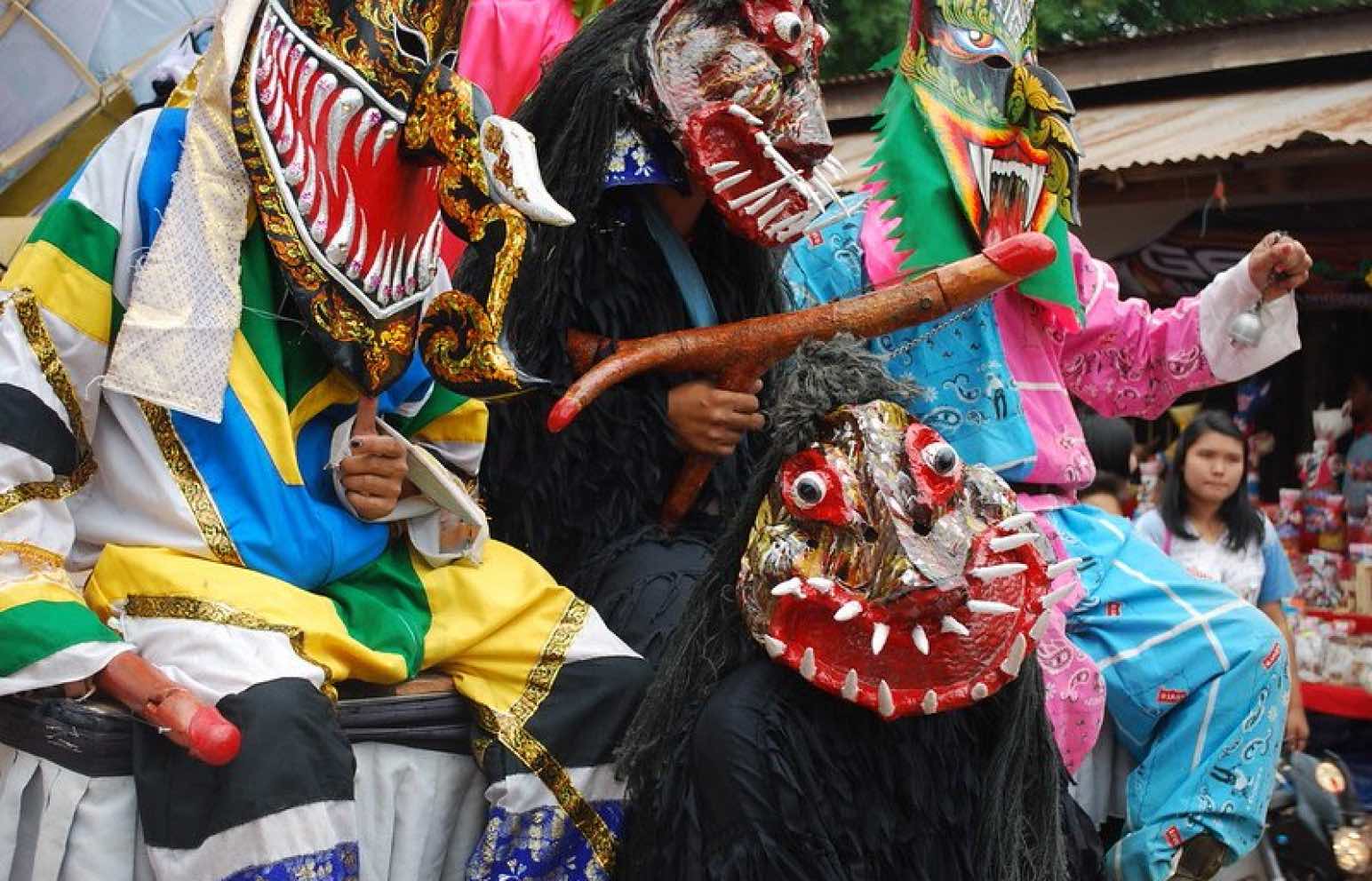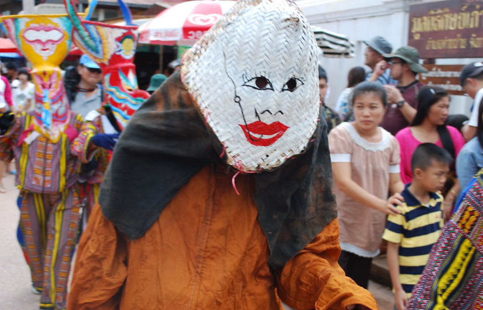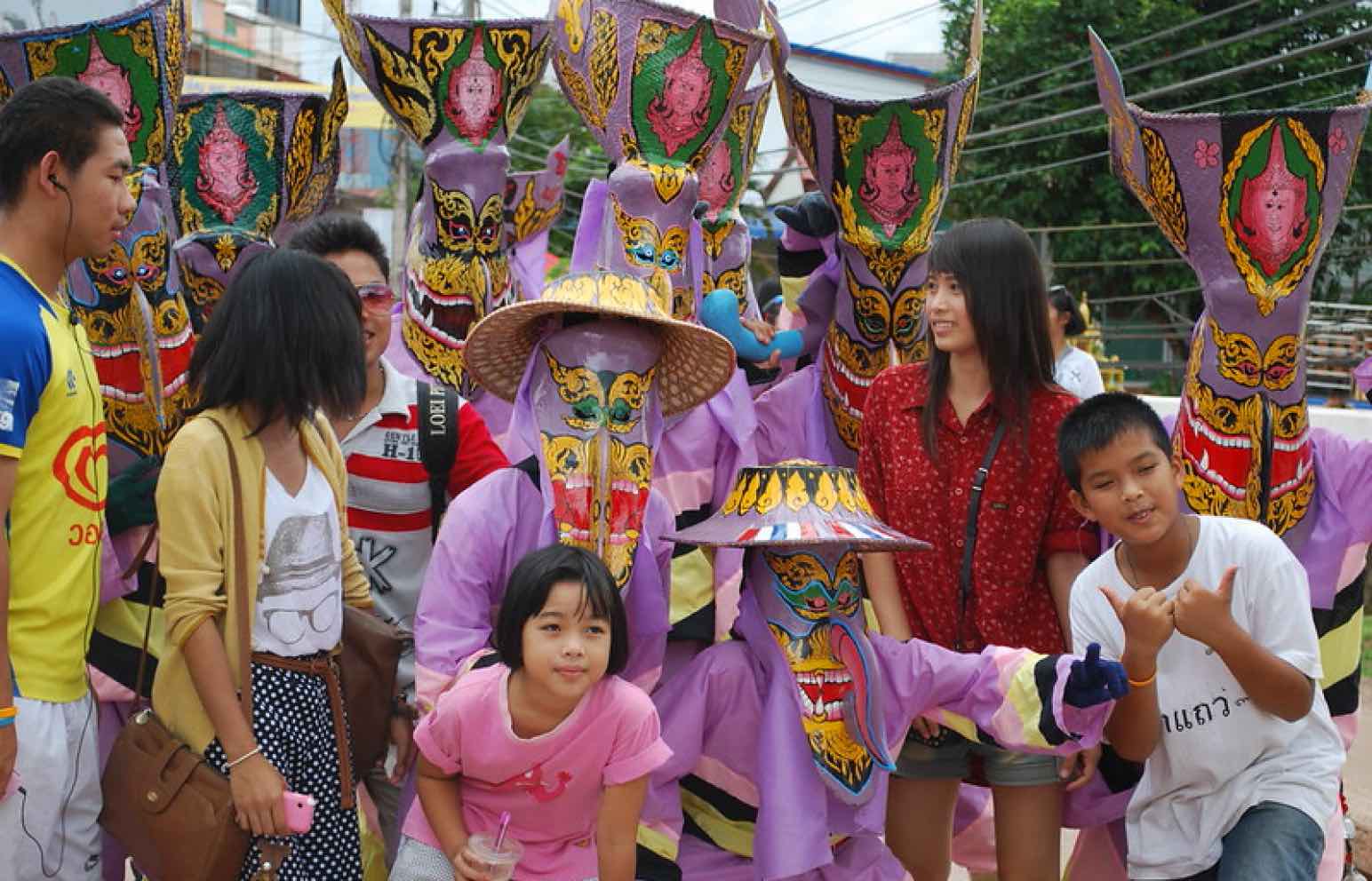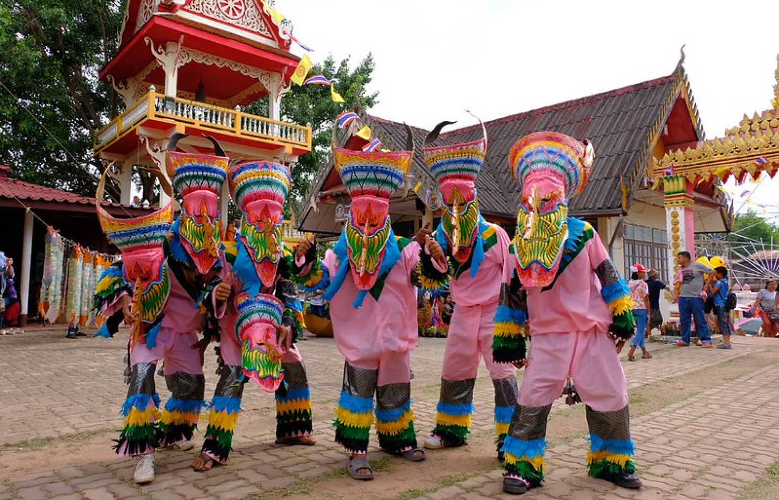 お祭りの名前が、タイ語で「ピー(霊)」「ター(目)」「コーン(仮面劇)」を表しているように、カラフルな仮面と衣装を身にまとった人びとが、太鼓や鐘の音とともに街を練り歩く。仮面は竹や椰子の葉などでつくられ、ユーモラスで少し不気味な表情が印象的。祭りでは伝統音楽に合わせた踊りや宗教儀式が行われ、地域全体が熱気に包まれる。タイの民俗文化と信仰が融合した独特の祭り。