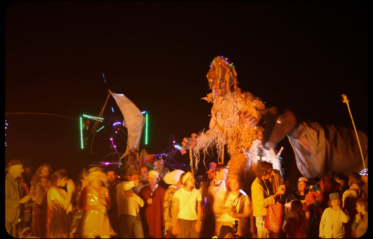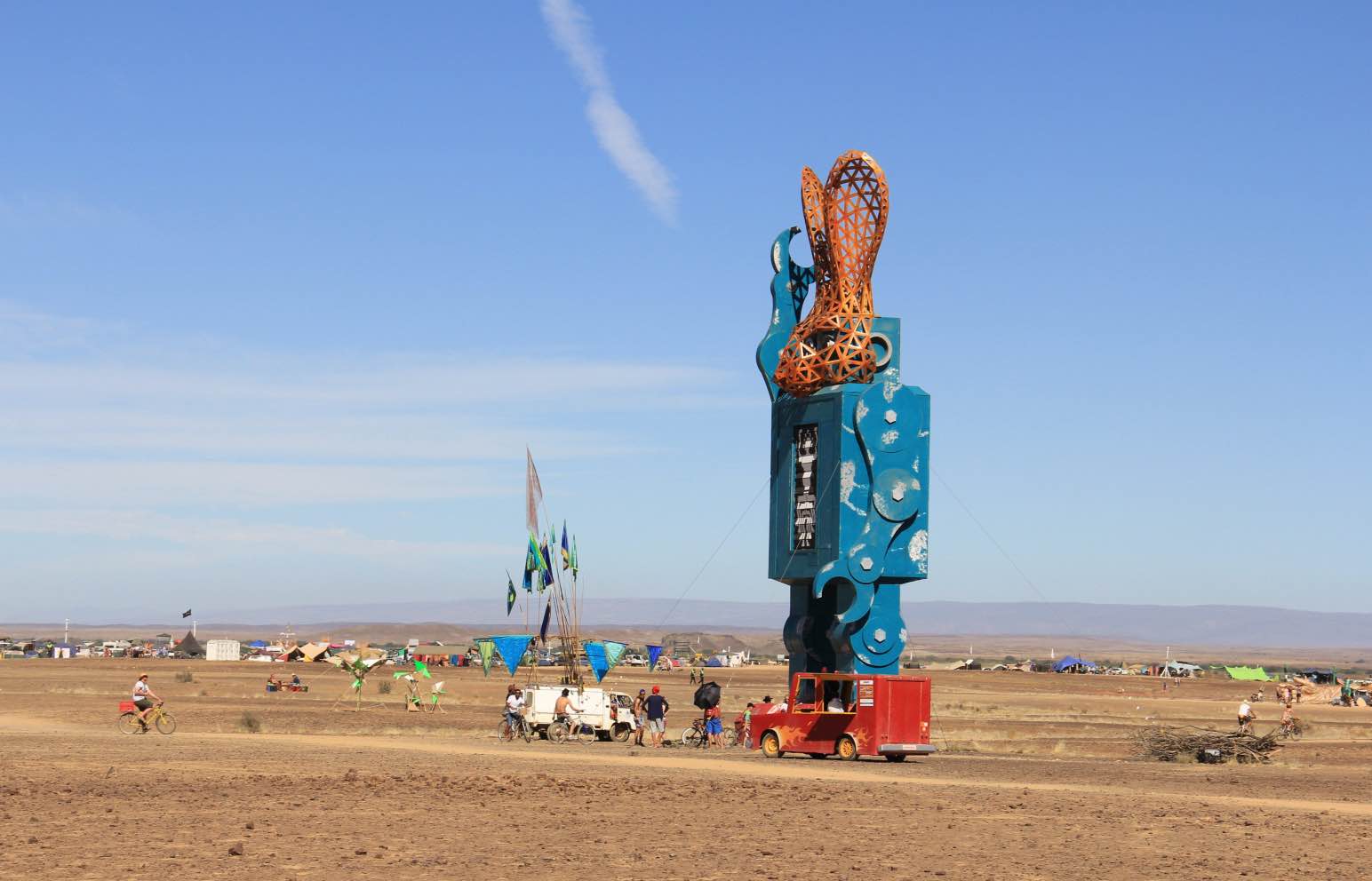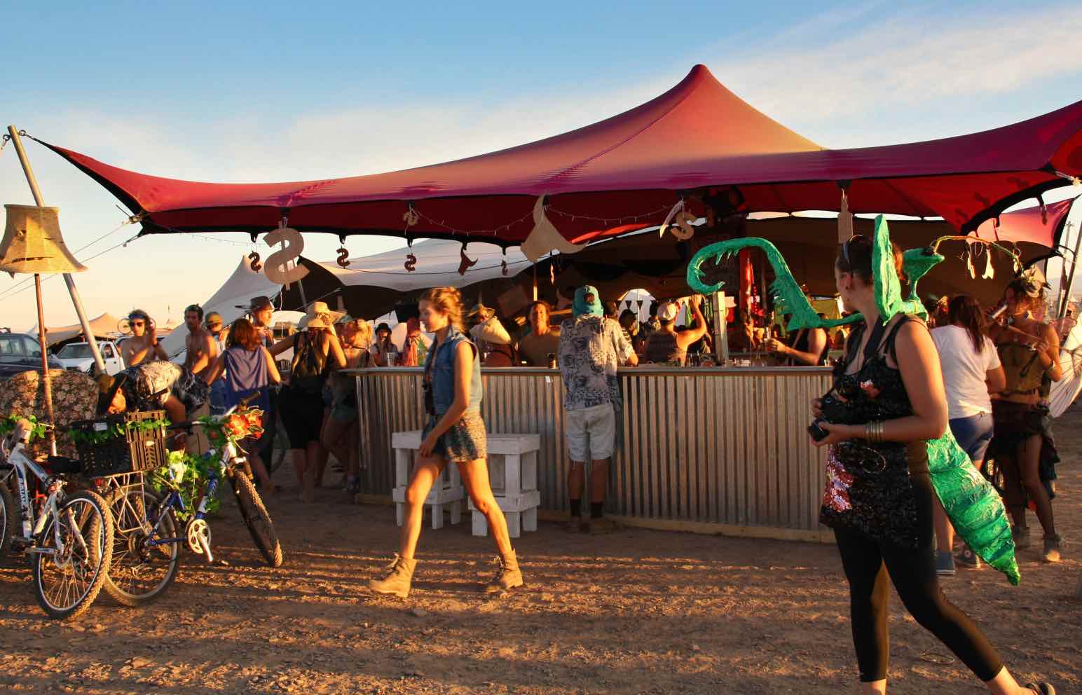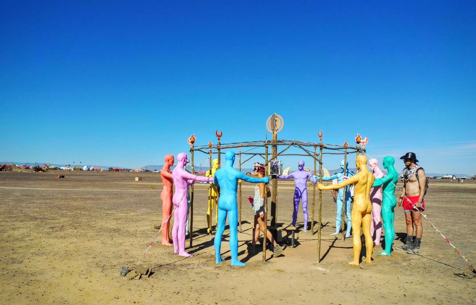 参加者は会期中の食べ物や飲み物、住処まで、生活に必要なすべてのものを持ち寄り、砂漠の一画に仮想都市を創りあげる。そこで繰り広げられるのは、奇妙な姿で走るミュータントビークル、巨大アートやパフォーマンス、コミュニティにおける生活空間でありながら参加者の交流の場としても機能するテーマキャンプなど、形も目的もさまざまな実験的アートプロジェクトたち。祭りが終われば、参加者たちはゴミも含めて持ち帰り、すべては解体され、跡形もなくなり、もとの風景だけが残る。