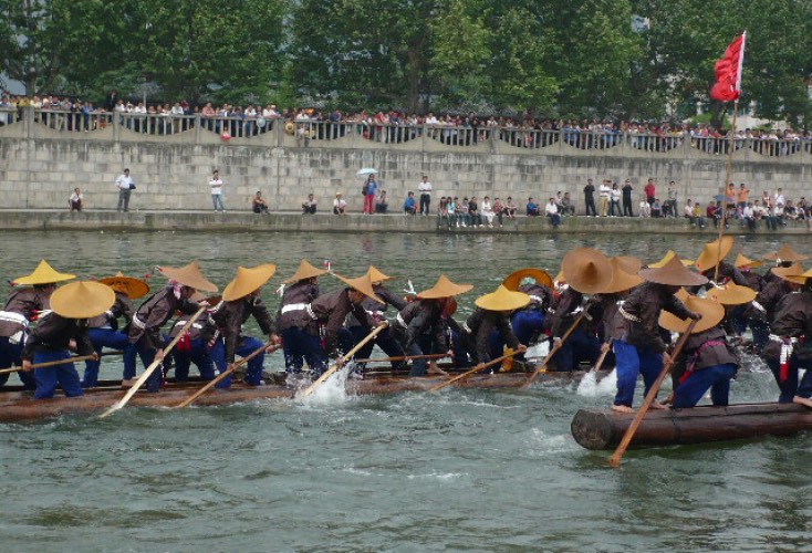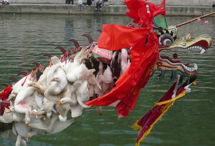 端午節の頃になると中国各地で行われるのが、ドラゴンボートフェスティバル。水の神や祖先への感謝、豊作と平安を祈るお祭りで、とくに中国・貴州省のミャオの民のドラゴンボートレースは荘厳。伝統衣装を身にまとった人びとが細長く優雅な形をした龍船に乗り込み、力強い太鼓のリズムに合わせて、船の上に立って船を漕いで川を進む。