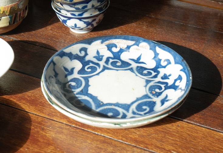 これは、ウズベキスタンの炊き込みご飯「プロフ」を食べるときによく使われている器。蚤の市で手に取ったのですが、コットンの花が描かれています。