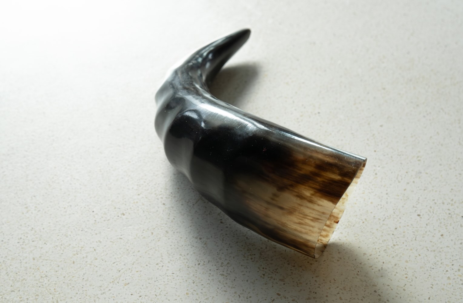 その際に使われることもあるのが、この盃。注がれるとテーブルに置けないかたちになっていて、その場ですべて飲みきらなければならないという、そんな遊び心のある盃なんです。しかも、これは本物の動物の骨でできています。