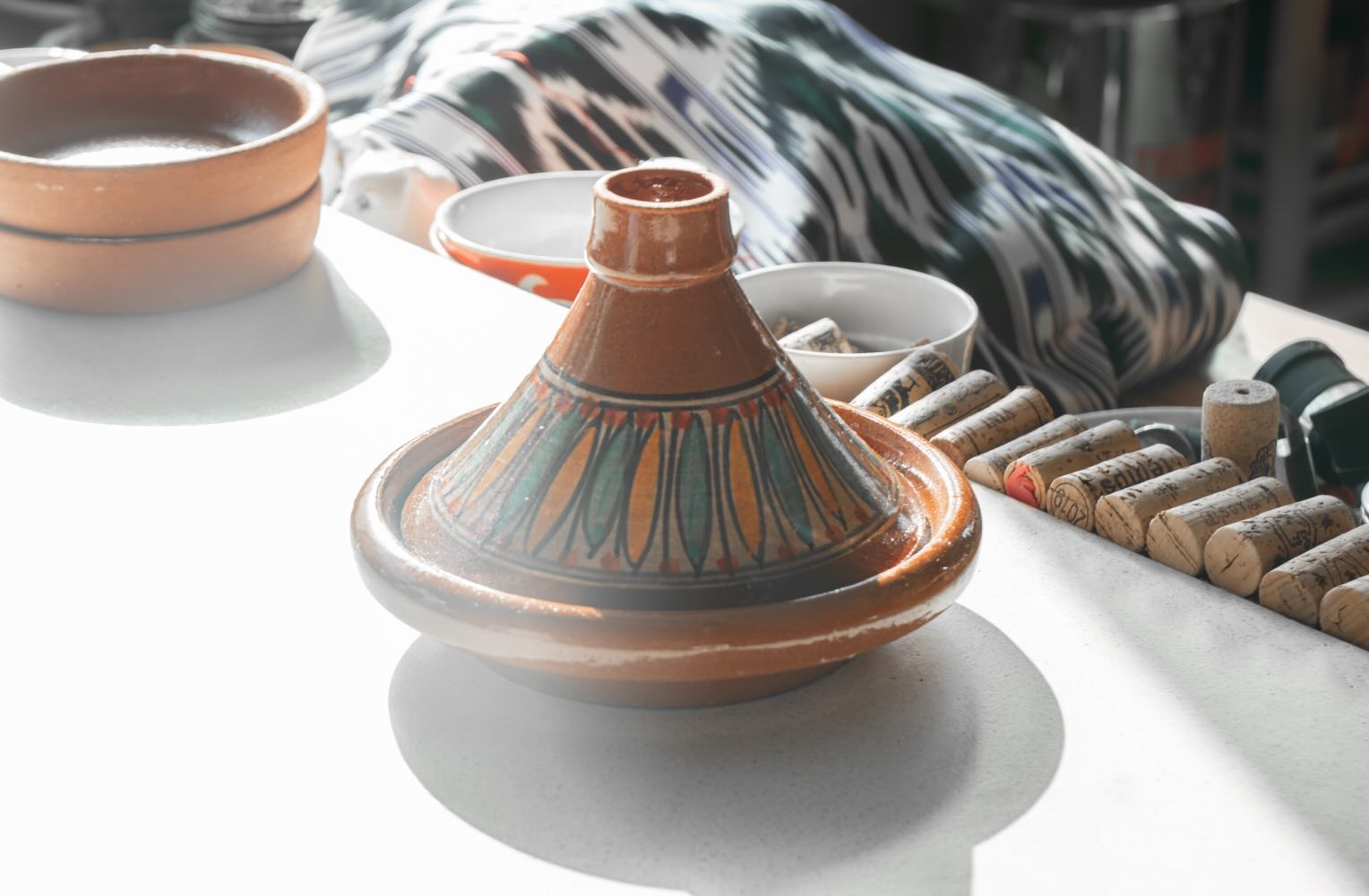 これは、モロッコで伝統的に使われている鍋「タジン」。帽子のようなかたちをした土鍋で、これは比較的小さめですが、現地には20〜25cmほどの大きさや、無地のものなど多様な種類があります。