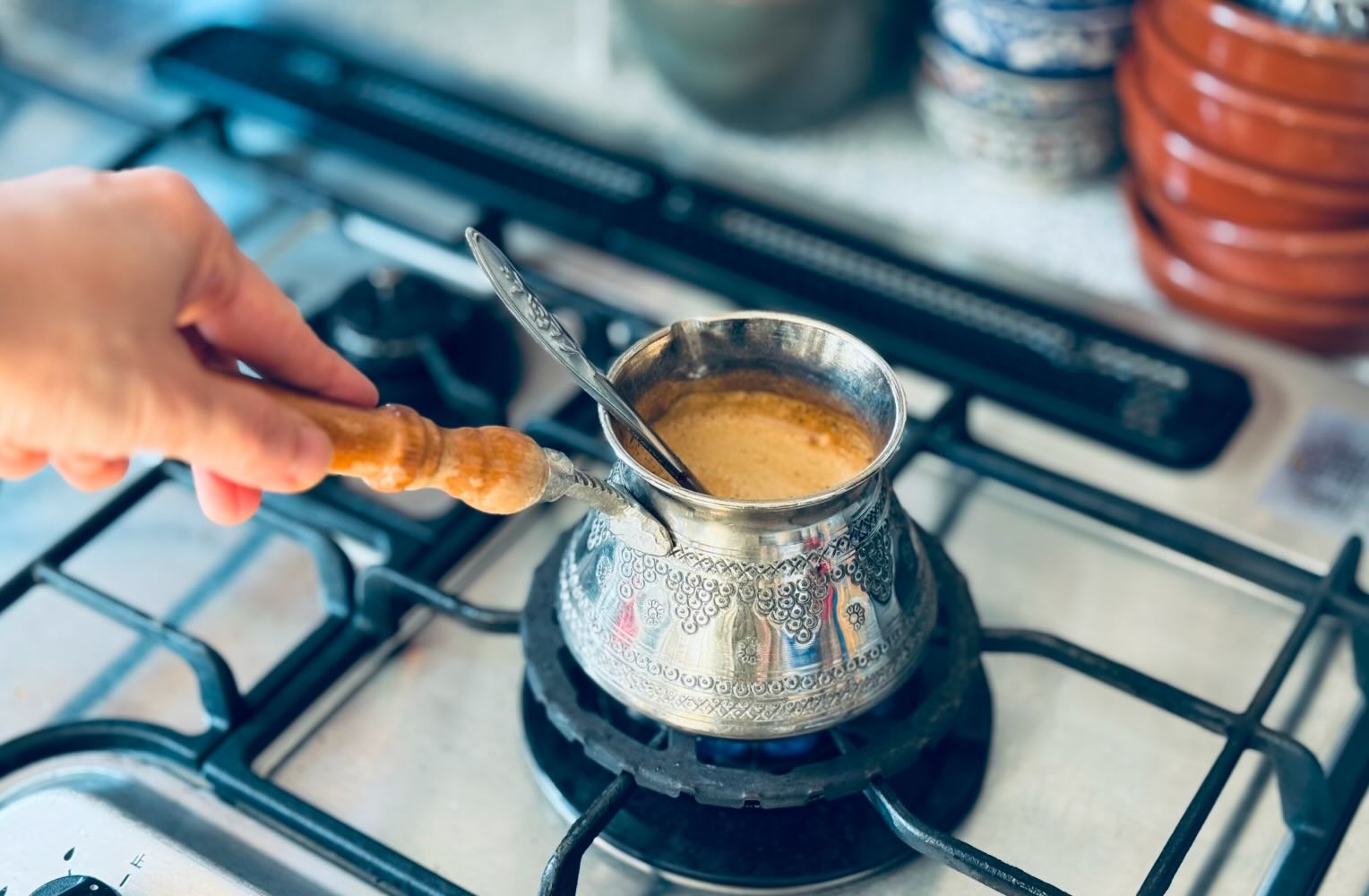 よく使っているのが、この「ジャズベ」と呼ばれるトルコの小さな片手鍋。トルココーヒーは粉と砂糖、水を入れて沸かし、デミタスカップに注いで粉が沈むのを待って、上澄みだけを飲みます。そのコーヒーを淹れるための道具で、トルコのお土産屋さんや問屋街などどこに行ってもよく見かけるものです。