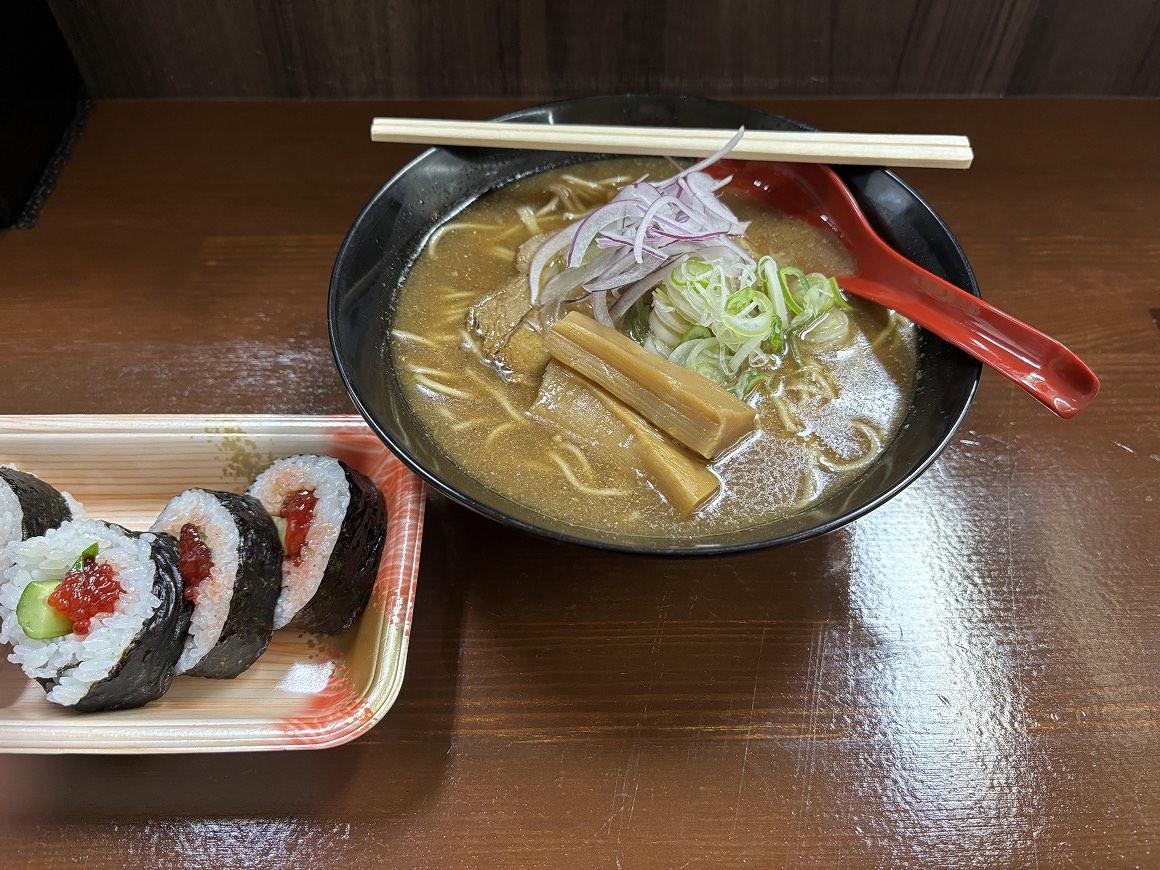すでに〈まぐろの源ちゃん〉の店先にはお寿司や海鮮丼がびっしりと並んでいる(青森県の魚介といえば、やっぱり下北半島の大間町や深浦町の本マグロ!)。それに弘前のイタリアンレストラン〈オステリア エノテカ ダ・サスィーノ〉の笹森通彰シェフが手がけるラーメン店〈麺屋コルトン〉には朝ラーメンもある。お店の人にひと声かけて、市場内で買ったすじこ巻きを広げてラーメンと一緒に食べる。朝からこんな贅沢が許されるなんて……!