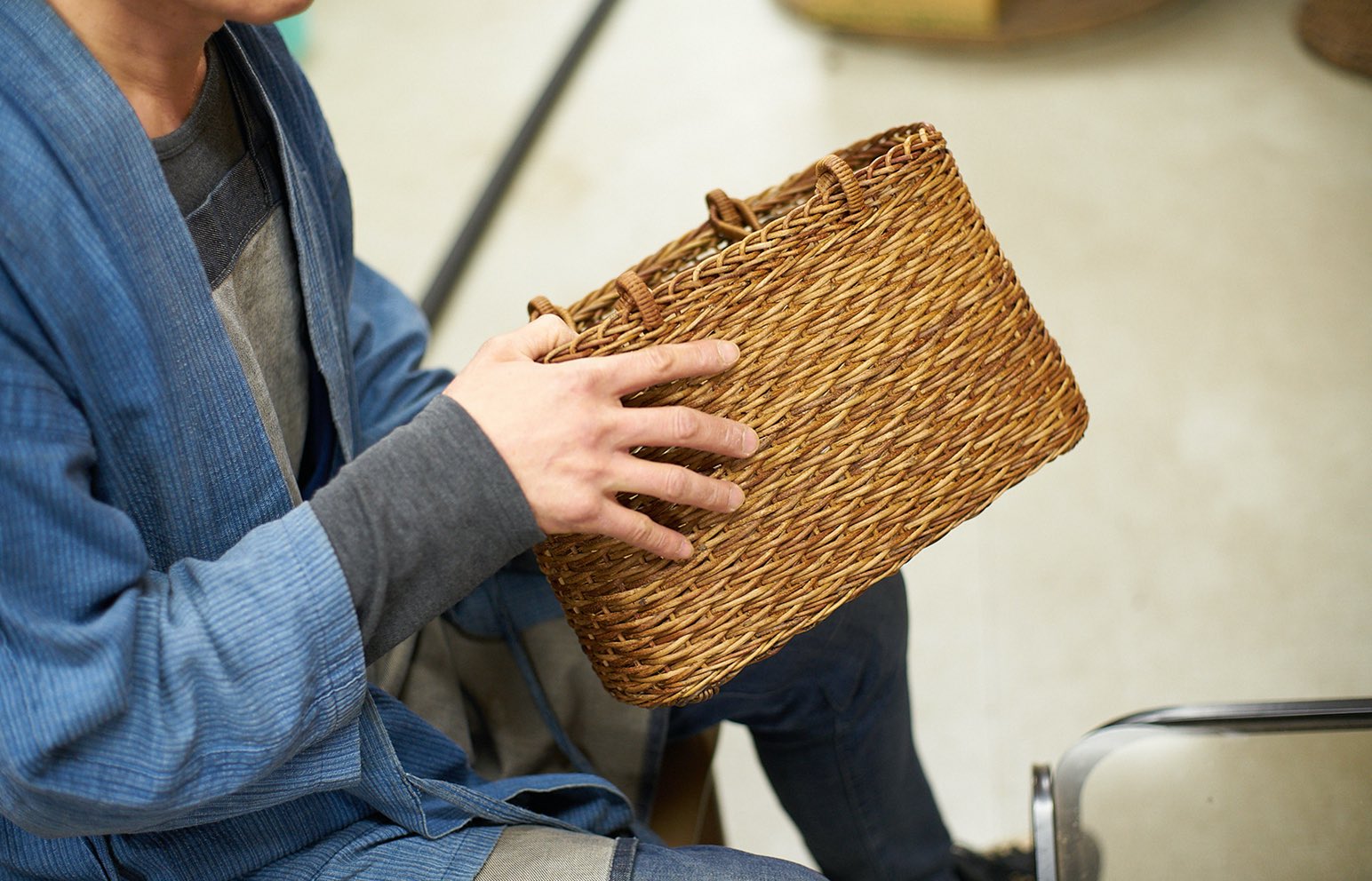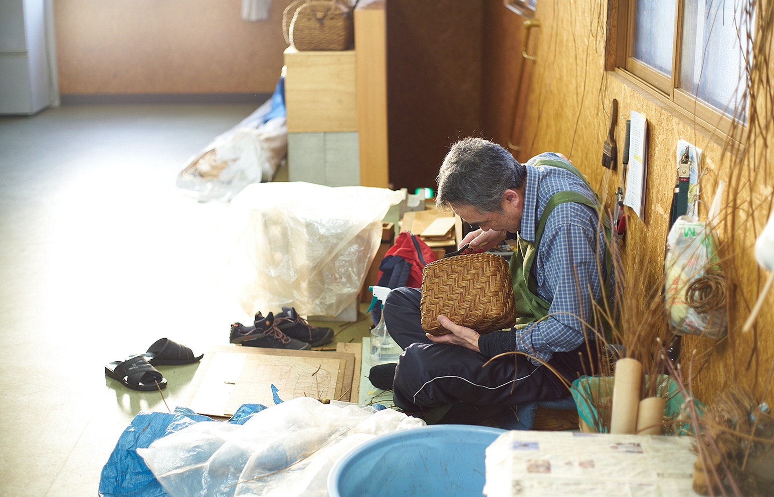 岩手各地で作られた竹細工や藁履、かんじきなど東北らしい手仕事が並ぶ〈森九商店〉。