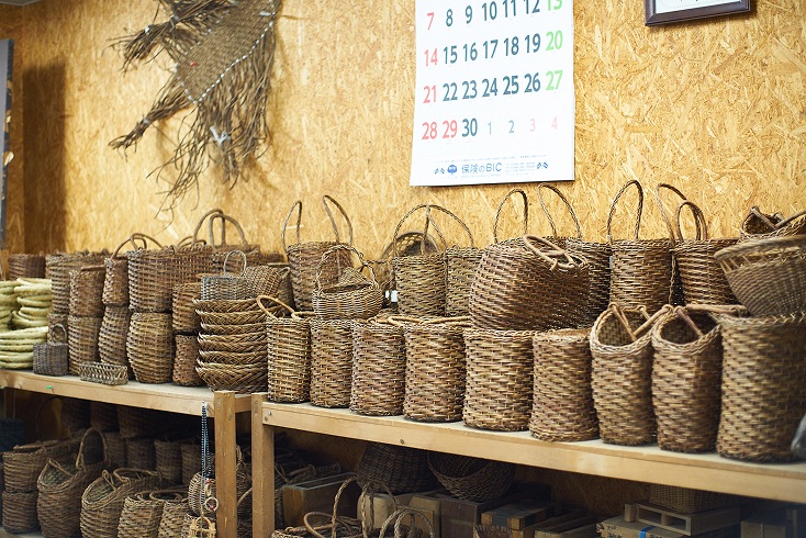 山ブドウ皮、アケビのつるでつくられたカゴが並んだ工芸店。1階が店舗、2階は職人さんたちの作業場になっている。もともとカゴづくりは、農閑期に農家の人たちがやっていた冬の仕事。北国の青森だから生まれてきたことがわかる。