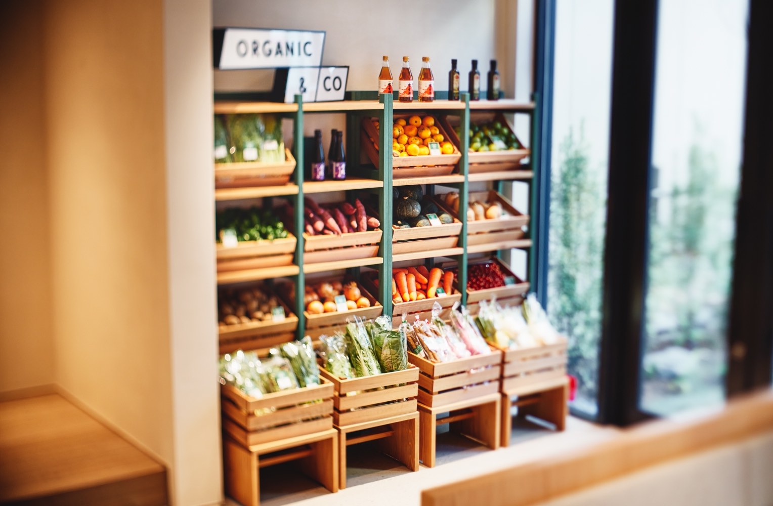 ムスブルミネの1階には、一日の始まりを優しく彩るカフェ〈SLB CAFE〉、毎日の食卓を楽しくするオーガニック野菜やこだわりの調味料が揃うオーガニックショップ〈ORGANIC&CO.〉が入る。