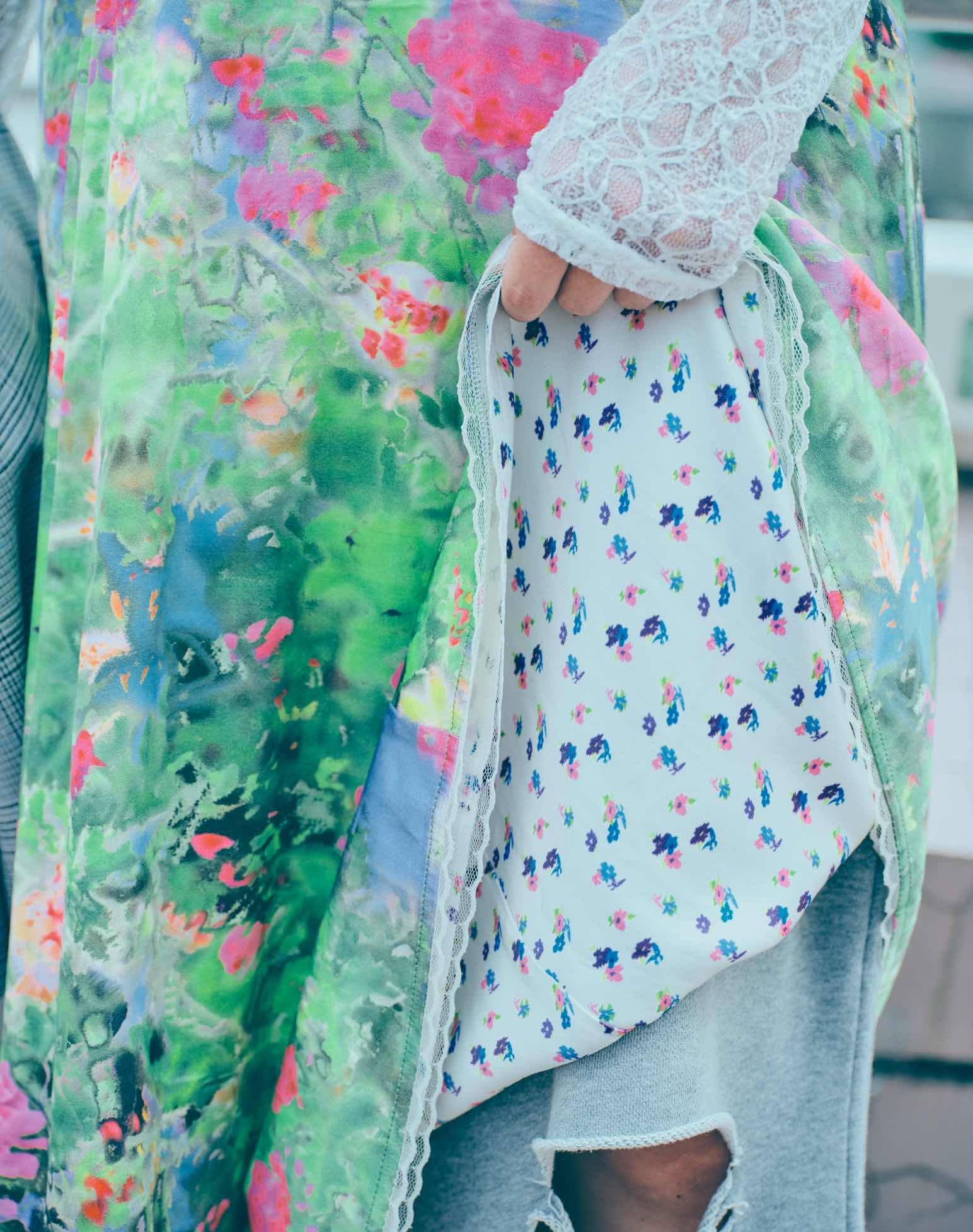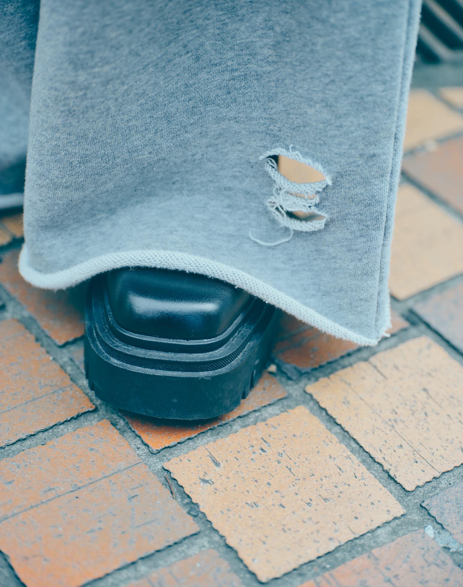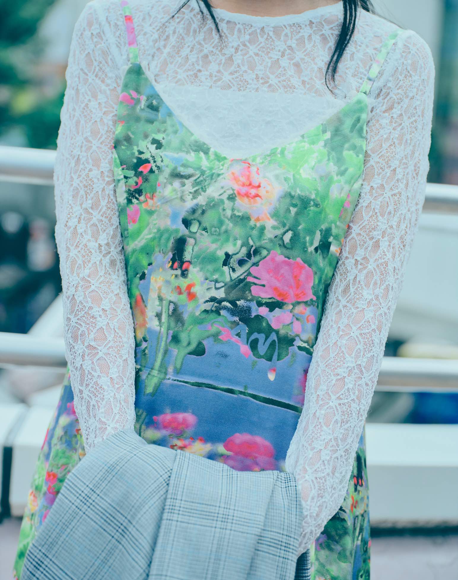 ゆるめのスウェットパンツは、私にとっての「いつも」のアイテム。「はじめて」の要素は、レーストップスとワンピース。秋でもこういう薄手のレースやワンピースを合わせて軽やかに重ね着を楽しむのもいいなと思って。実はこのワンピースはリバーシブルになっていて、裏表で別の柄で着こなせるんですよ。
