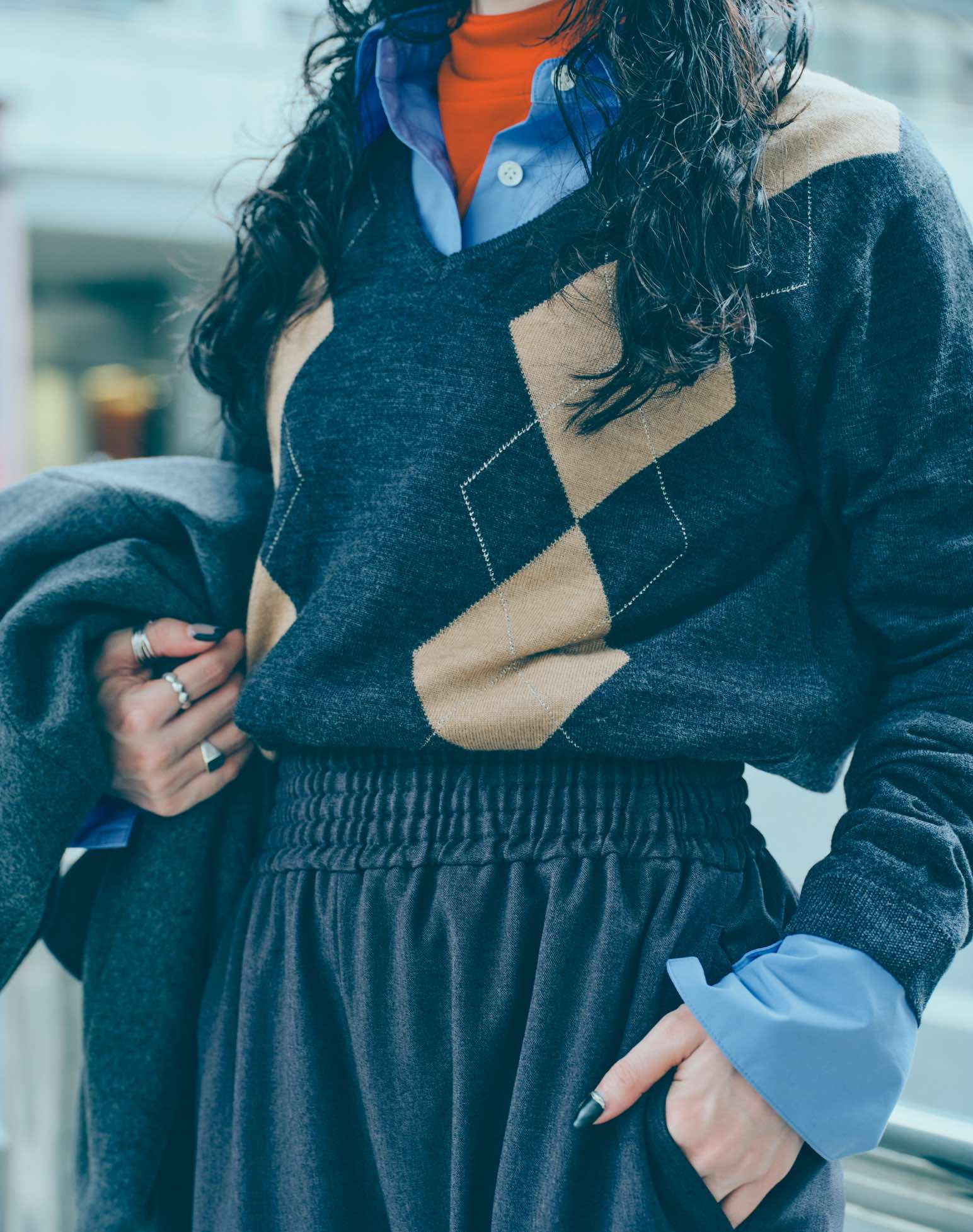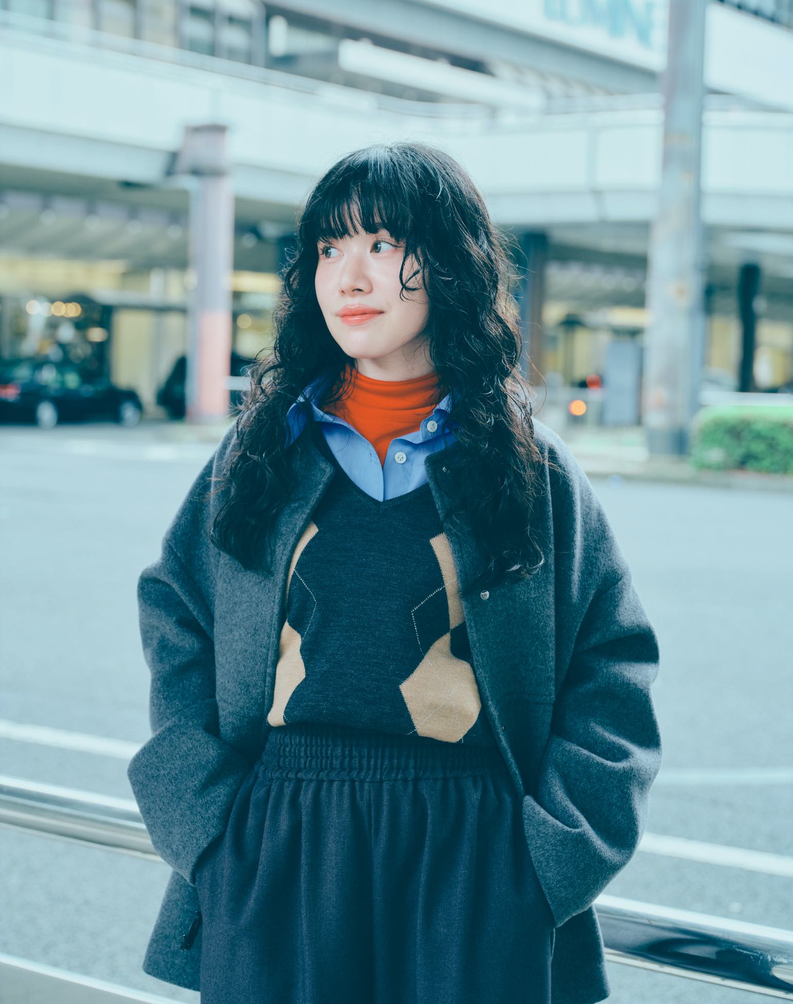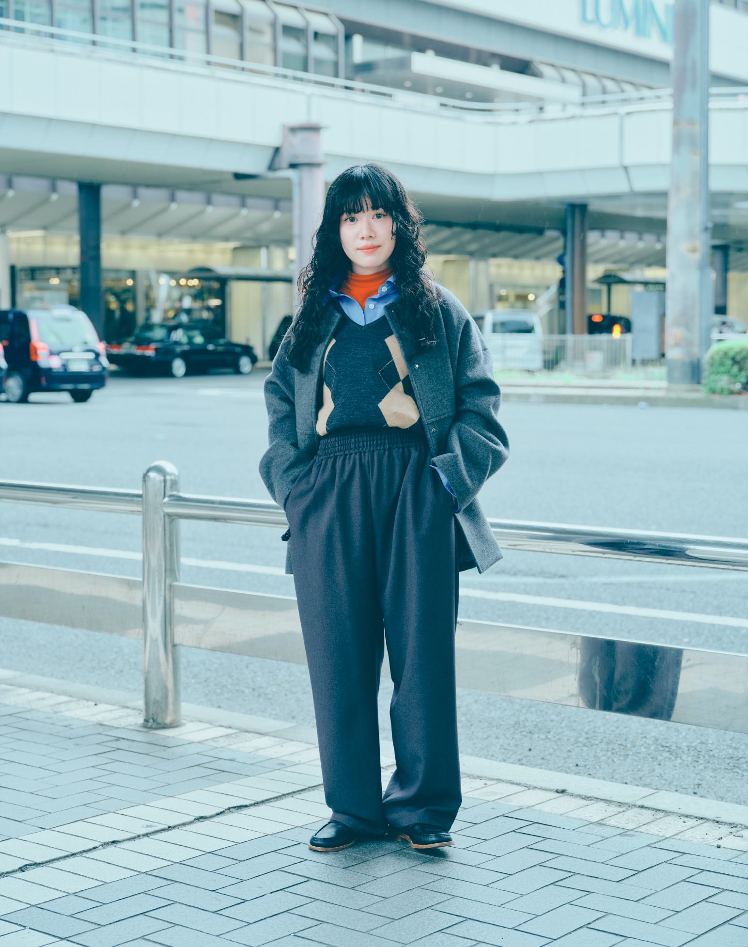 JOURNAL STANDARDのノーカラーコート ¥34,100、アーガイル柄ニット ¥13,200、コットンシャツ ¥16,500、ウールタートルニット ¥7,150、ワイドパンツ ¥12,100(JOURNAL STANDARD ルミネ大宮店)、その他は私物