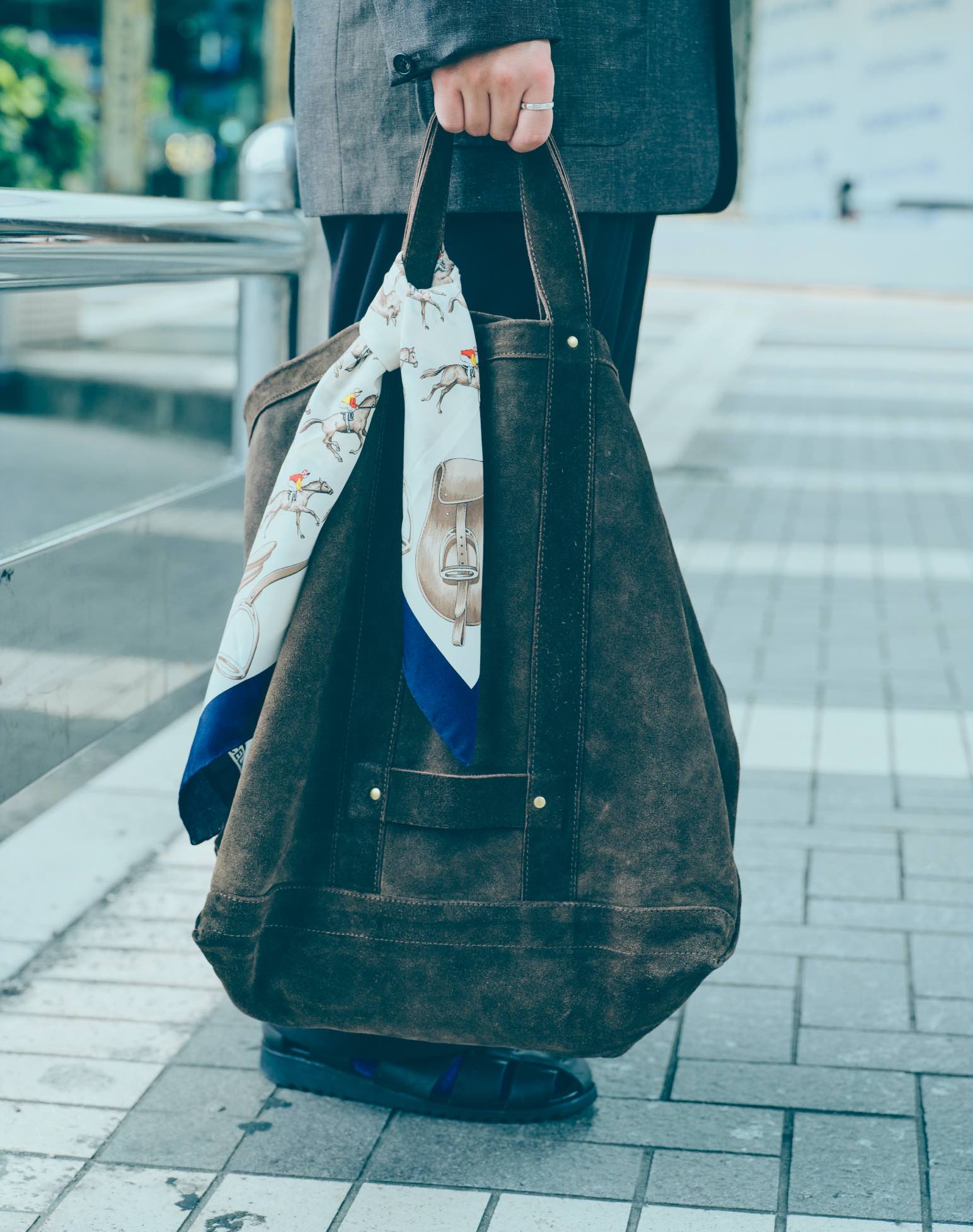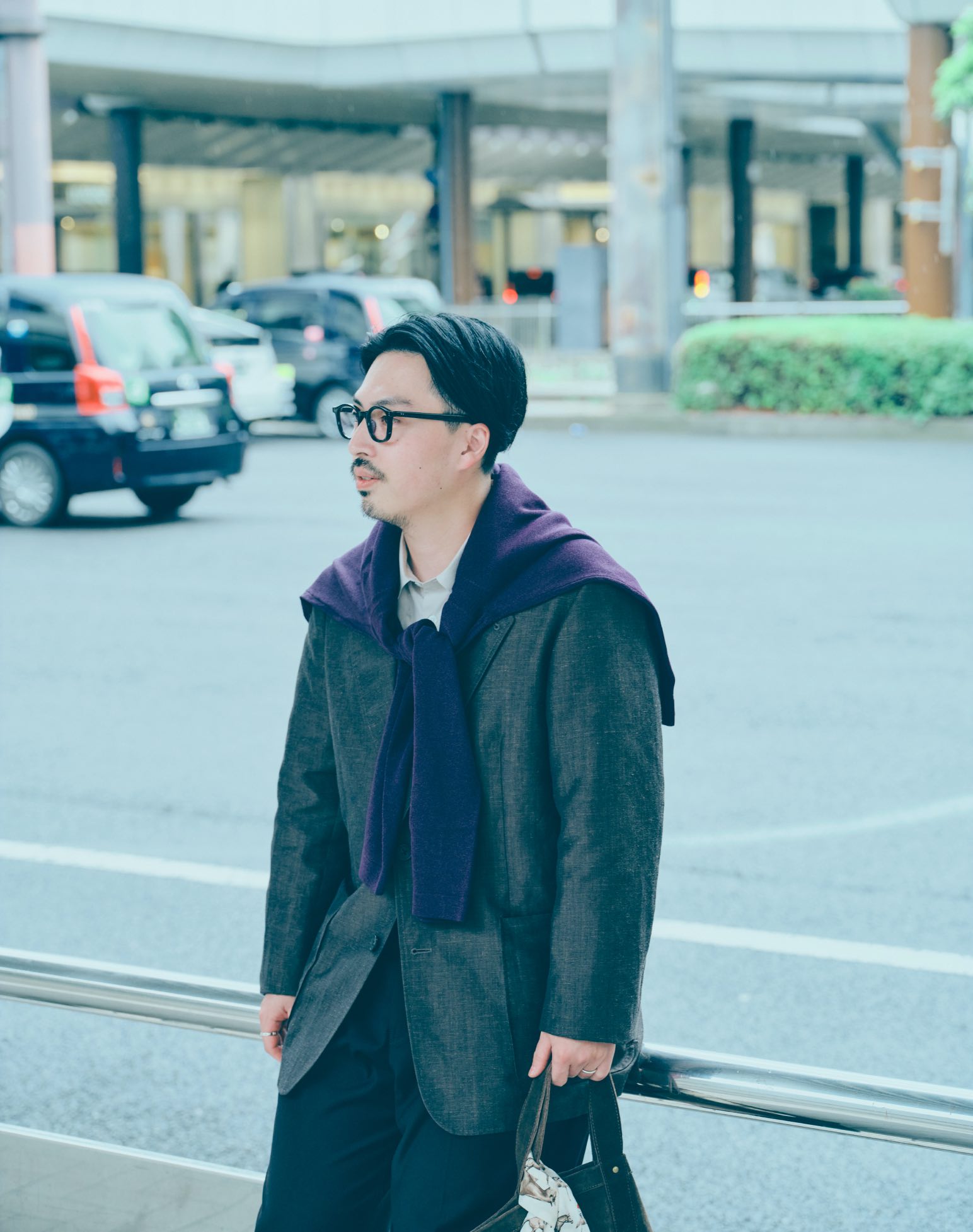 メガネが「いつも」のトレードマークです。普段はカジュアルな服装が多いんですけど、ここ最近はキレイめな大人っぽい感じもいいなと思って、レザーのトートバッグやビンテージのストールのような、キレイめな小物遣いで「はじめて」挑戦してみました。