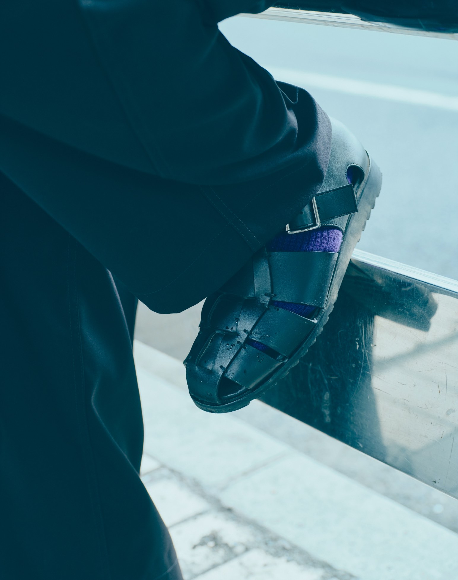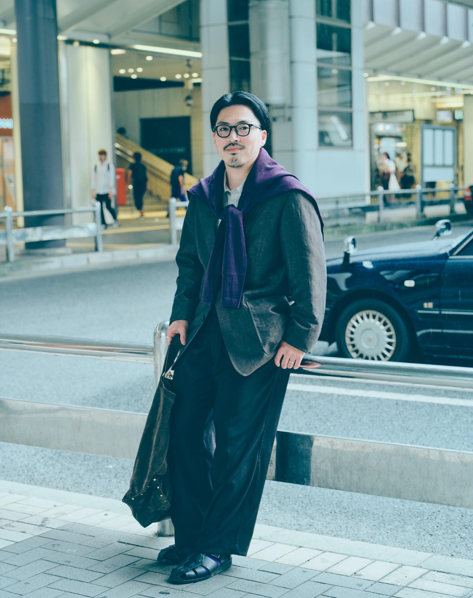 URBAN RESEARCHのジャケット ¥39,600、肩にかけたパープルニット ¥18,700、ワイシャツ ¥36,300、レザーサンダル ¥65,000、ビッグトート ¥36,300、スカーフ ¥46,200、(URBAN RESEARCH ルミネ大宮店)、その他は私物