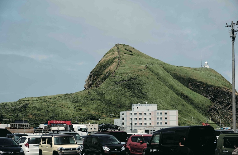 稚内港からフェリーに乗り込んで1時間半ほど。船内アナウンスを聞いて、2等室で雑魚寝していた体をのそりと起こす。フェリーの窓から、やさしい曲線を描く緑の小高い丘と、穏やかな青い海が見える。絵本にでてくる遠い異国の世界みたい。
