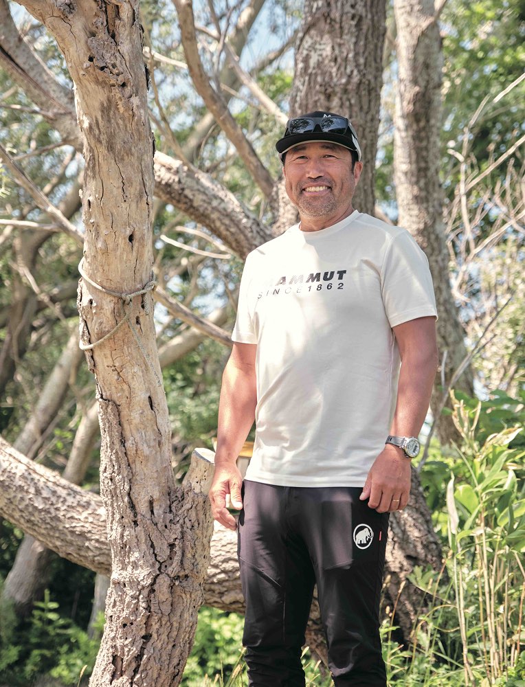 利尻生まれの山岳ガイド、渡辺敏哉さん。登山はもちろん、サーフィン、シーカヤック、釣り、スノーボード、パラグライダー......春夏秋冬、山・海・空で自然と遊ぶ天才。ペンション〈レラモシリ〉では料理を振るまうことも。