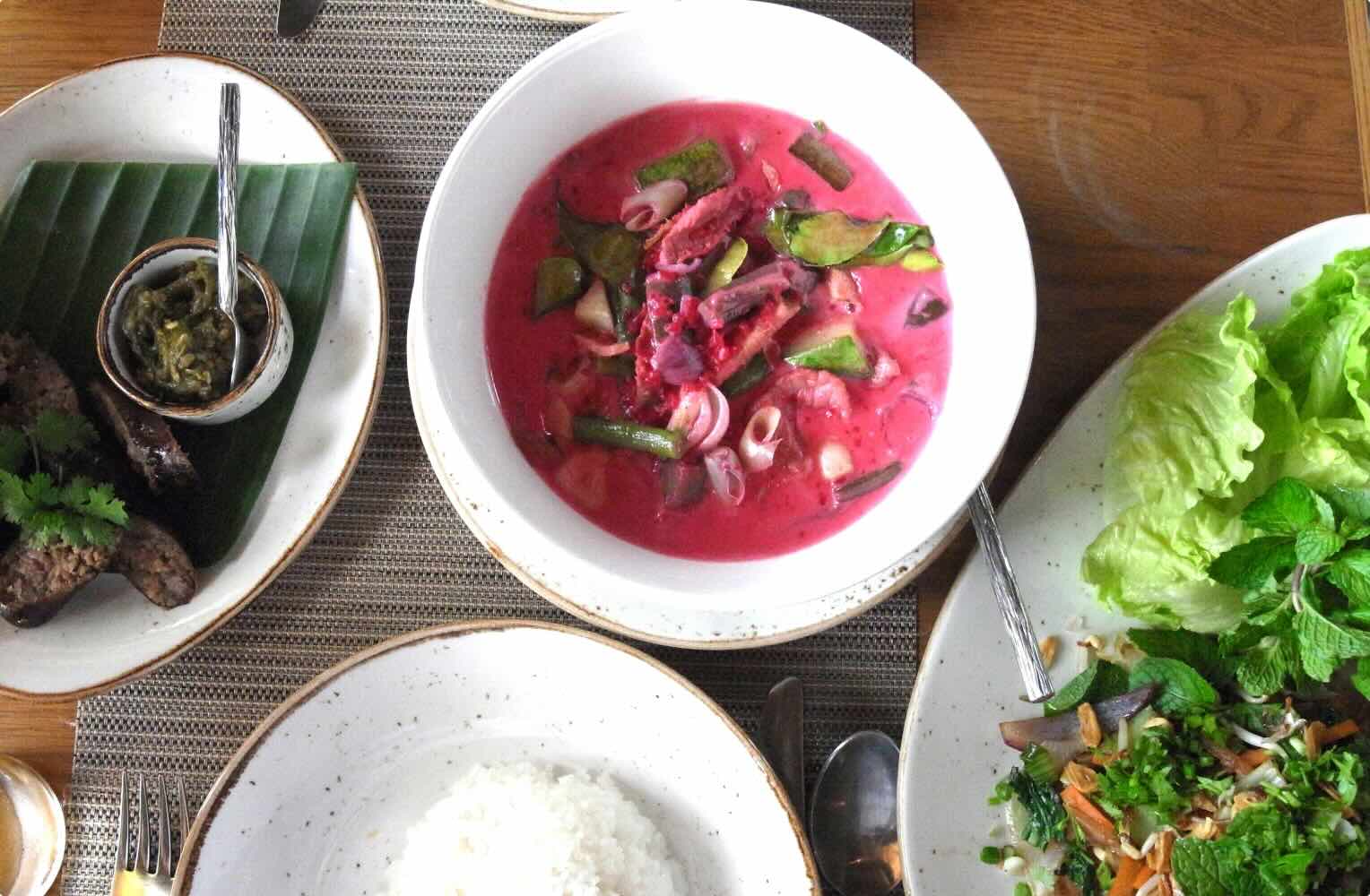 ココナッツミルクと一緒にソムカイパーを煮ると美しいピンク色が鍋中に広がる。メインの具は豚肉、ソースは優しくまろやかで、酸味と甘みのバランスが程よい初体験の味。料理名は「リーン・ソム・ムー」と言うそうだ。