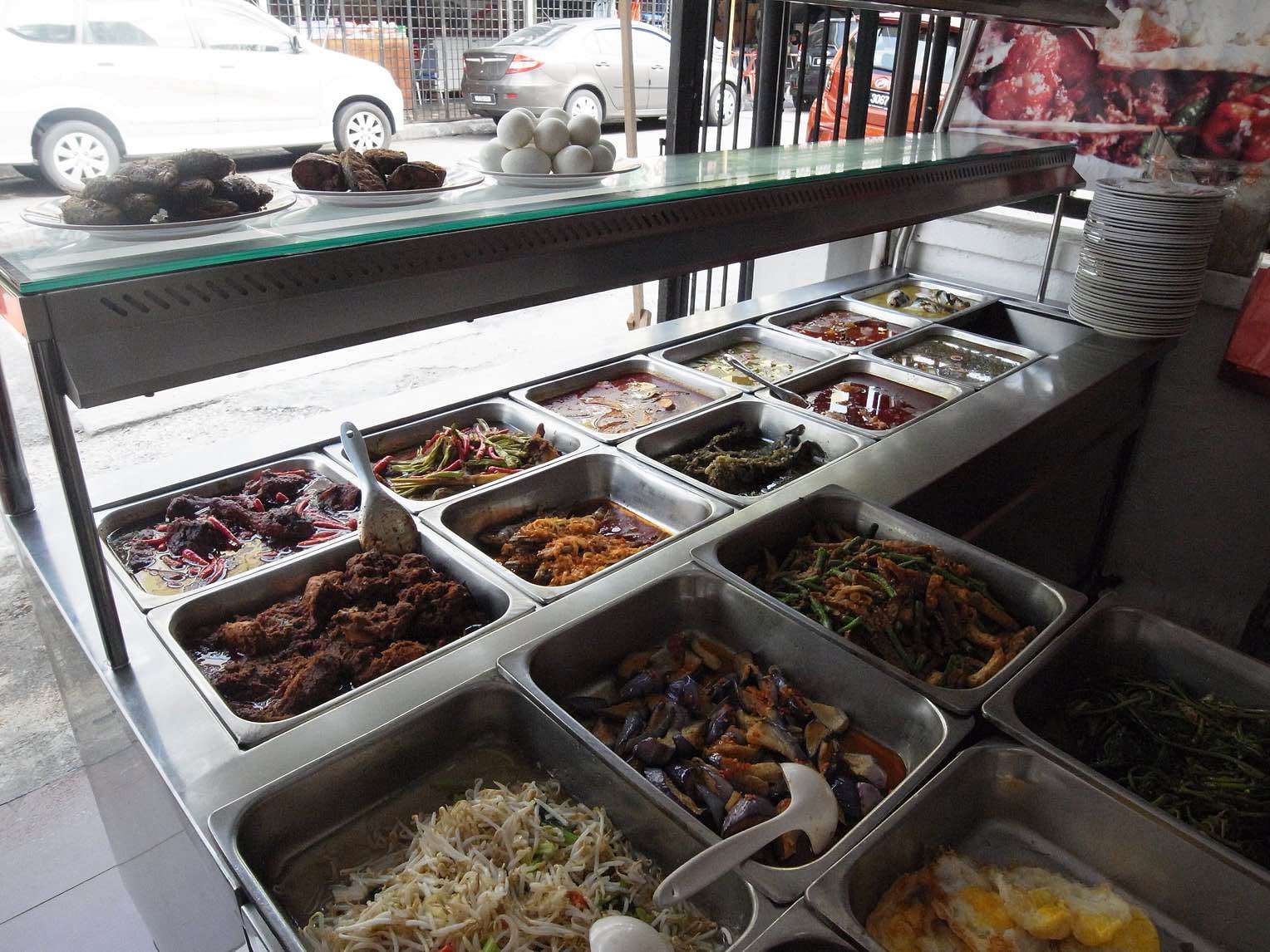 どの店に入ってもショーケースにはずらりと料理が並んでいる。脇に小さくてカラフルなプラスチック製の平皿が積み上げられていて、食べたい料理を盛りつけ、席へ運ぶシステムだ。あっという間にテーブルの上は小皿であふれかえった。