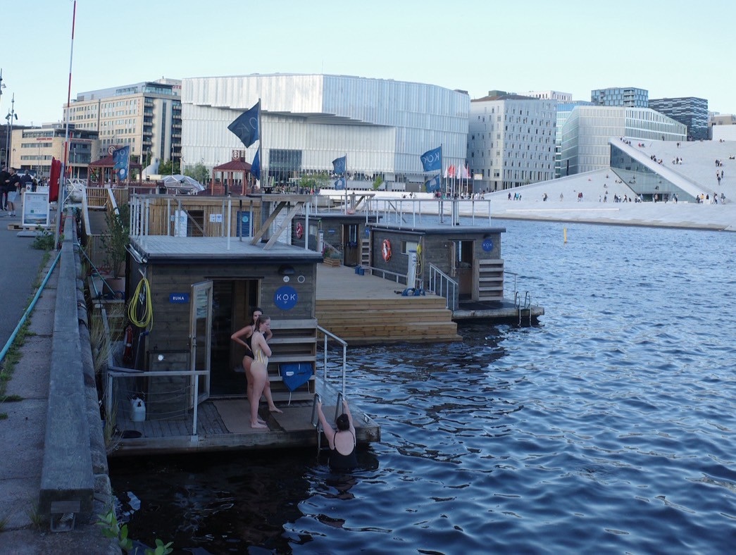 まずは首都のオスロを散策。すると、海にボートがぷかぷか浮かび、煙突からもくもく煙がのぼる光景が現れた。まさかと思ったら、やっぱりサウナだった。