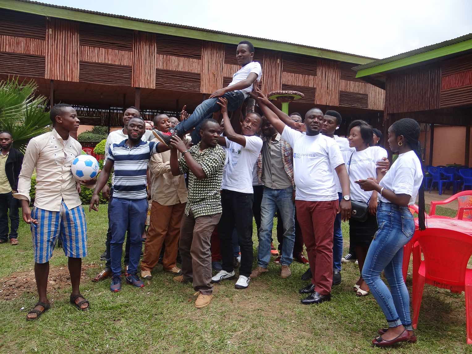 コンゴ民主共和国北キヴ州ブテンボでの、子ども兵士の徴兵阻止におけるアーティストの役割に関する啓発活動の様子。