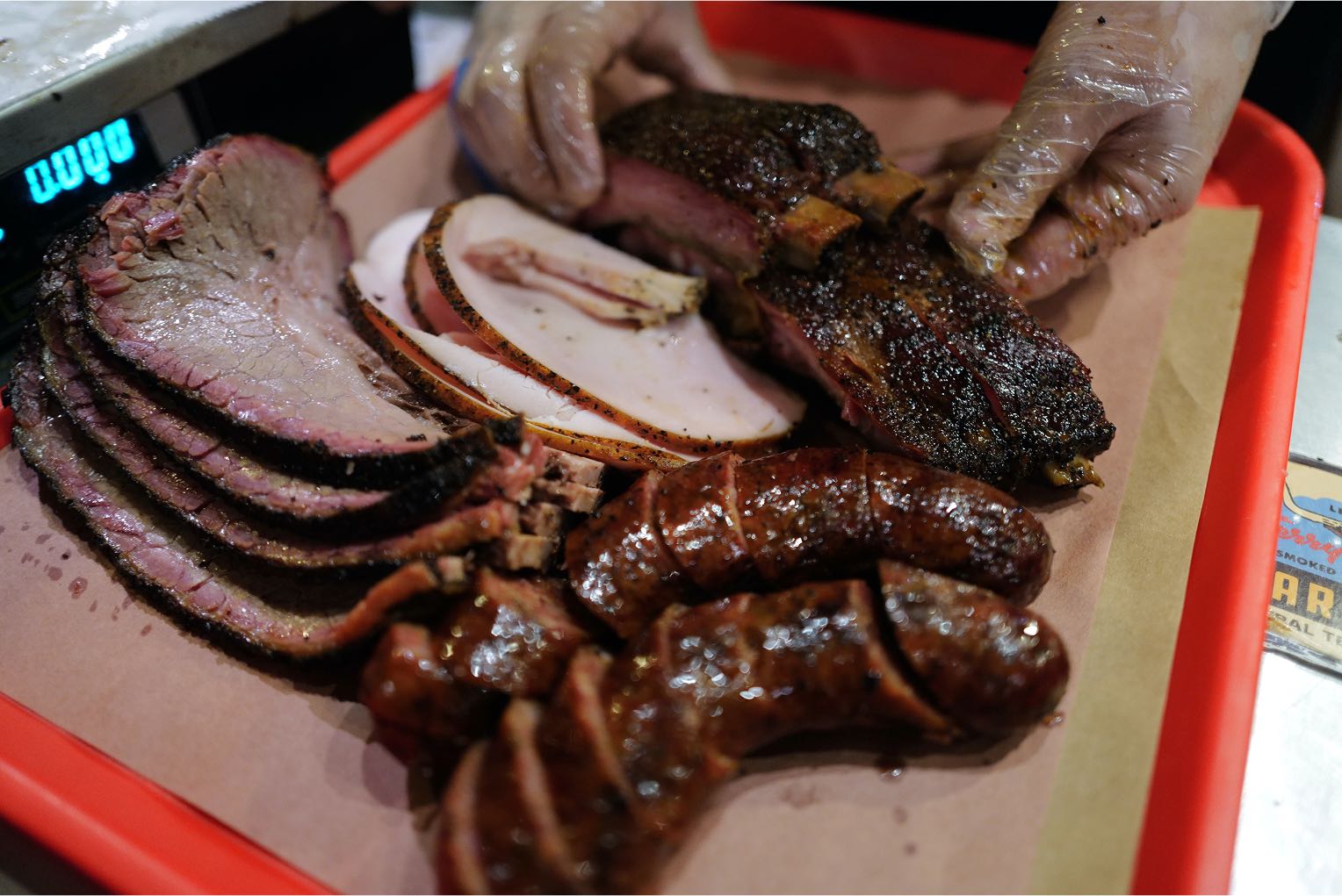 ビーフブリスケ、ポークリブ、ターキー、ソーセージの盛合せ。
