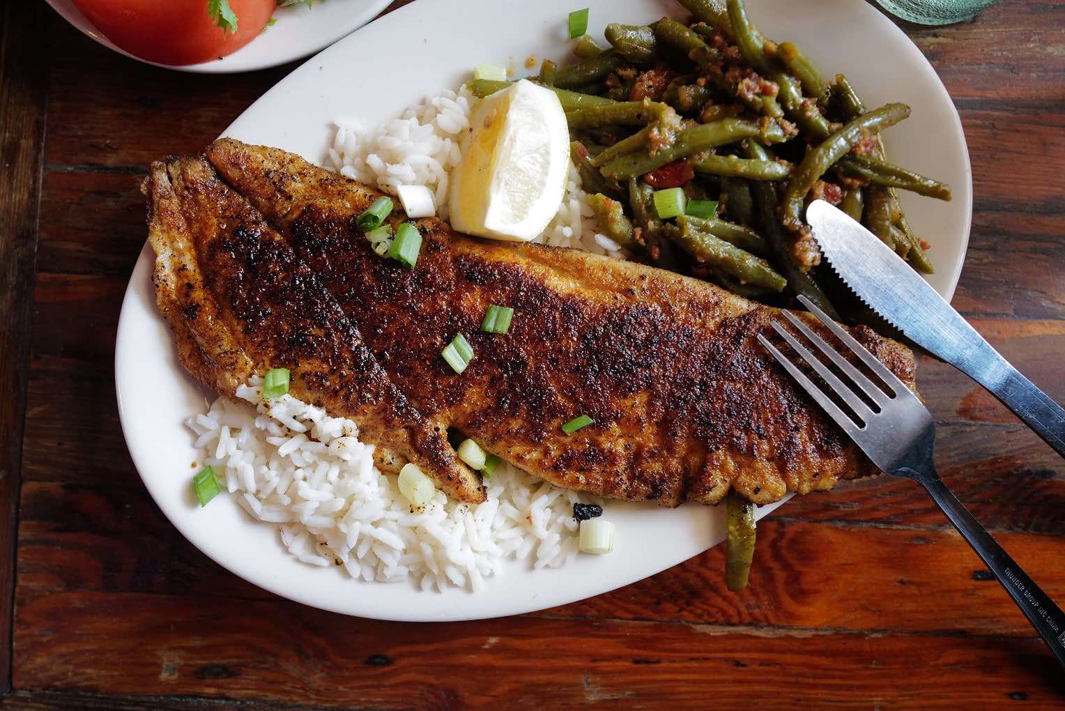 人気の煮込み料理であるガンボや米を使ったジャンバラヤなど香り豊かなものが多いが、僕のアンテナが反応したのは、「ブラッケンドレッドフィッシュ( Blackened Red Fish」。魚の表面に粉状のミックススパイスをまぶし、こんがりと焼いた料理だ。