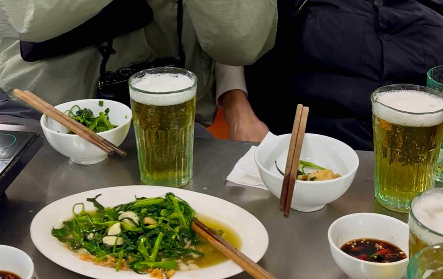 ビールがすすむような、鍋、チャーハン、麺、野菜炒めや豆腐のおかずといった料理があってごはんもおいしい。たっぷり食べて飲んで、一人1600円ほど。ごはんがおいしくて安くてありがたい。いよいよハノイ滞在がはじまる!