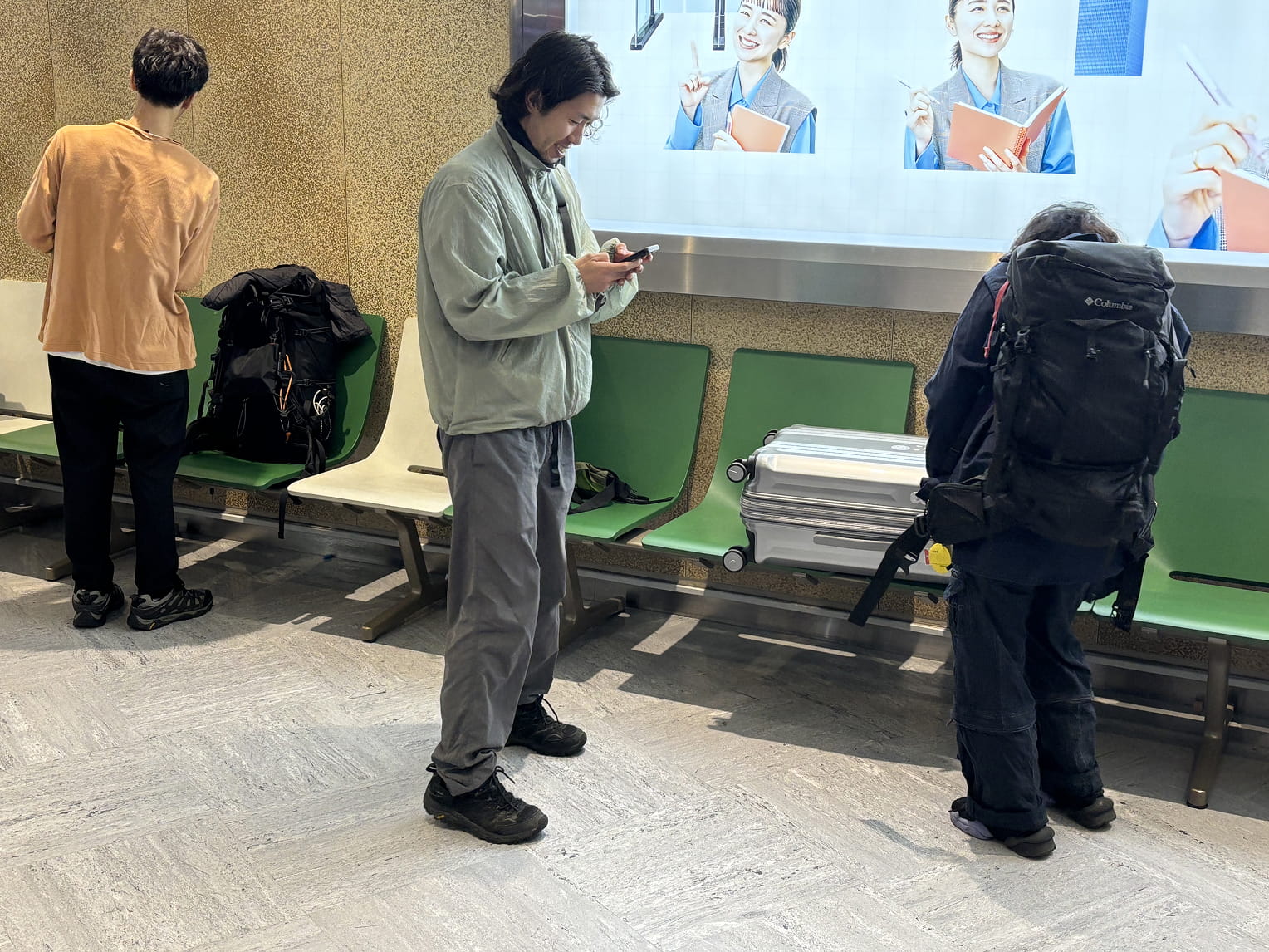 空港で荷物を最終チェック。左から山崎、鈴木、磯部。