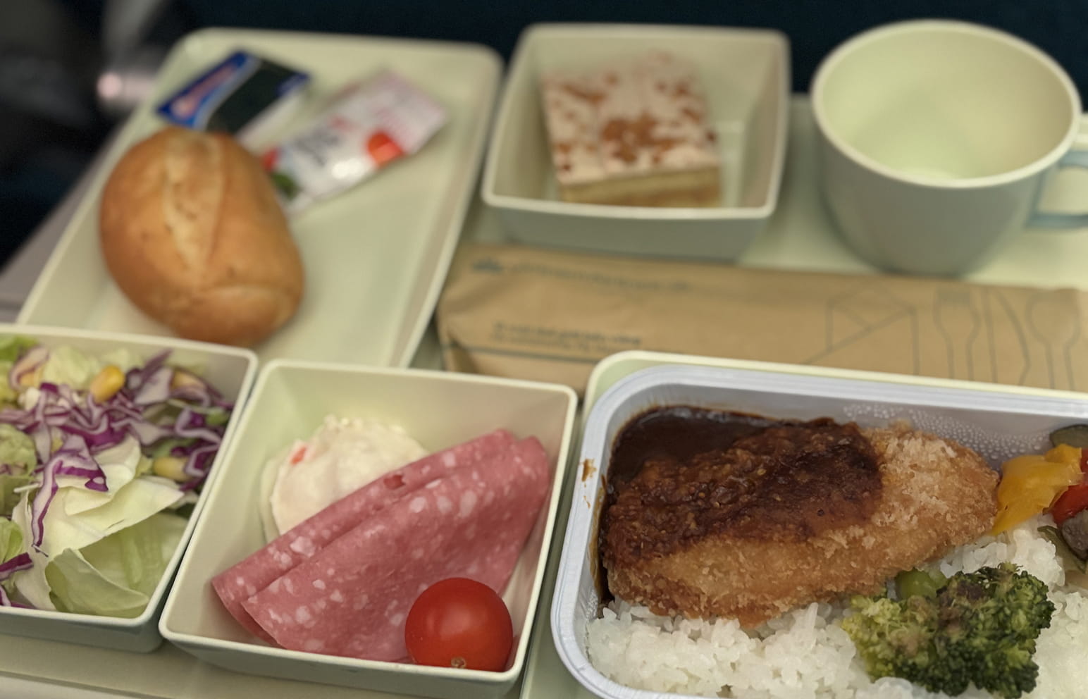 前夜は眠らずに仕事と荷造りをしていたこともあって、ターコイズブルーのブランケットに包まれて離陸を待たずに即寝。いい匂いがして目を覚ますと、ランチタイムだった。アオザイの制服を着た添乗員さんたちが料理をサーブしてくれる。豚のすき焼きor鶏のカツレツ。どちらを選ぶかでサイドメニューとデザートも変わる献立の凝りよう。BIA HA NOIとBIA SAIGONを頼んで、ハノイ班で乾杯。すでに機内からベトナム気分だ。