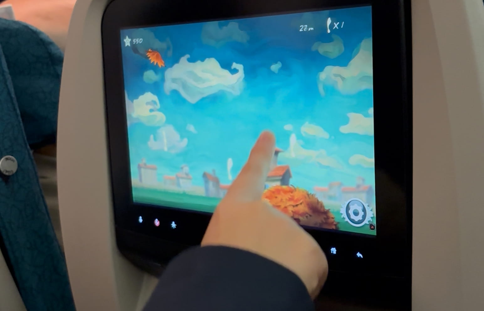 食後、後部座席に座っている鈴木はPCを開いて仕事を始めた。山崎は動画を撮っている。そして隣の磯部は「はっぱ」というゲームをはじめた。機内モニターの画面を指でタップして、枝についた最後の一葉が上へ下へと操り、種子や雪の結晶を集めていく。はっぱが地面に着いたりカラスや蜘蛛にぶつかるとゲームオーバー。非常に繊細な操作が求められるシュールなゲームだ。