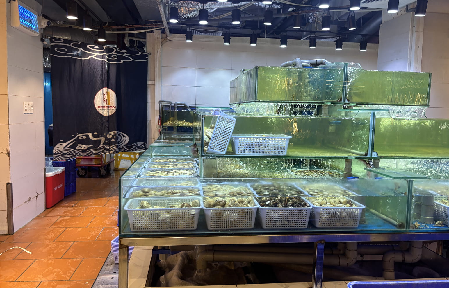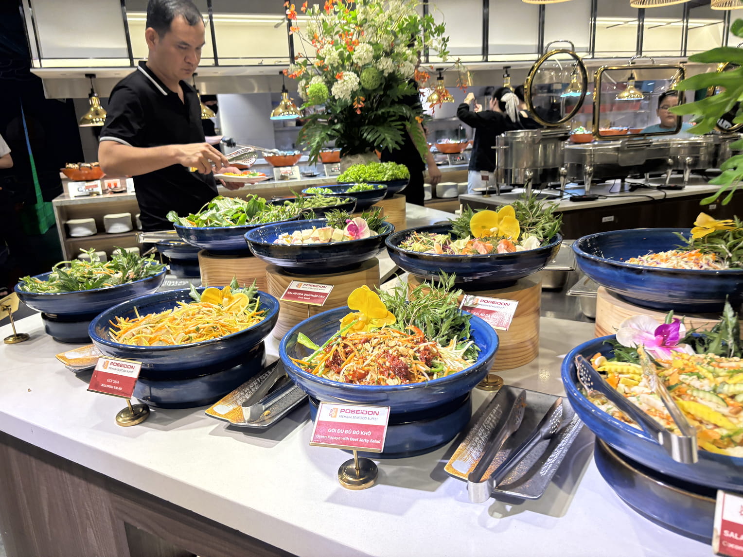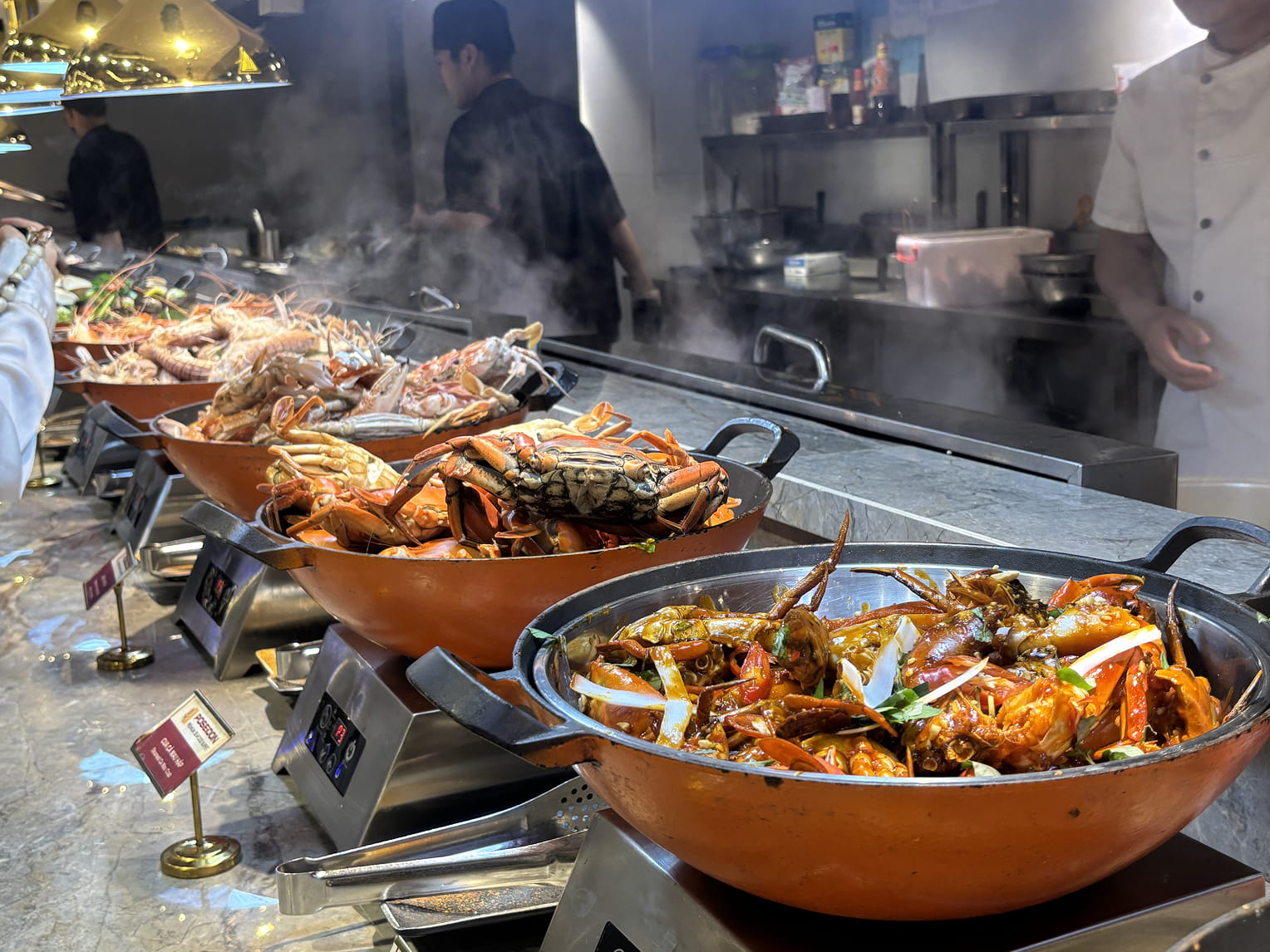 Buffet Poseidonは海鮮料理を中心に、サラダ、鍋料理、肉料理、デザートのチェーやフルーツまで、とにかく種類が豊富。とくに海鮮は圧巻で、店の奥にはいけすがあり、常に新鮮な状態で提供されている。