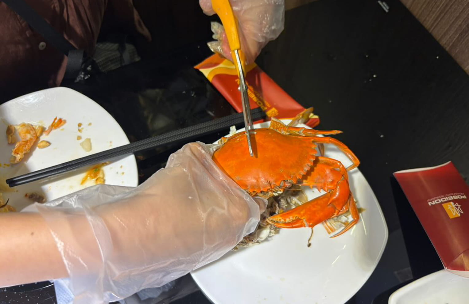 隣の席をちらっと見ると、手袋をはめハサミを上手に使いながら手際よく食べている。殻はテーブル下のゴミ箱へ。なるほど、そういうシステムか。