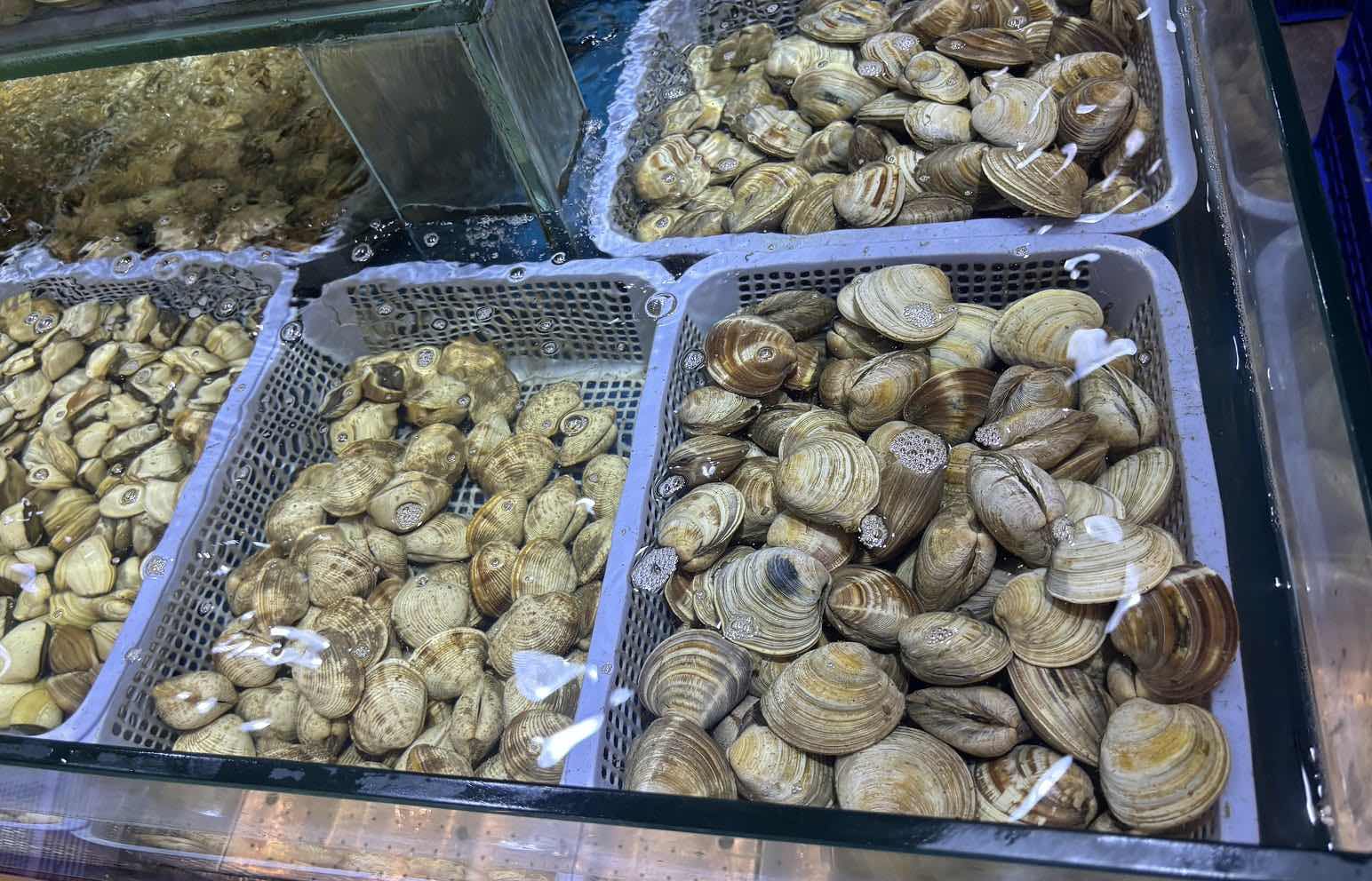 エビ、カニ、貝類は大きな鍋で茹でられ、できたてが次々と補充されていく。