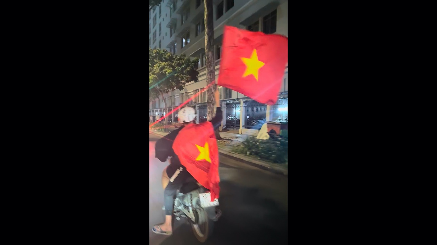 順調にバイクを手配し、ベトナム国旗を片手にまたがる。道路は国旗をはためかせ、クラクションを鳴らして勝利を祝うバイクでいっぱいだ。