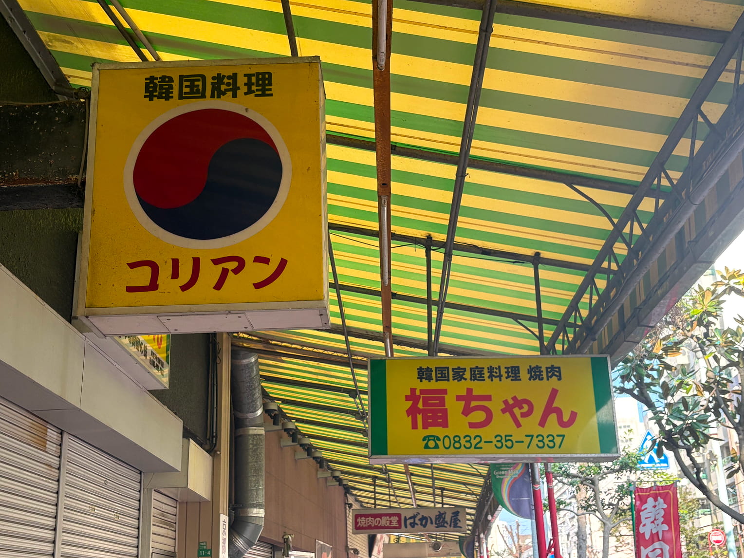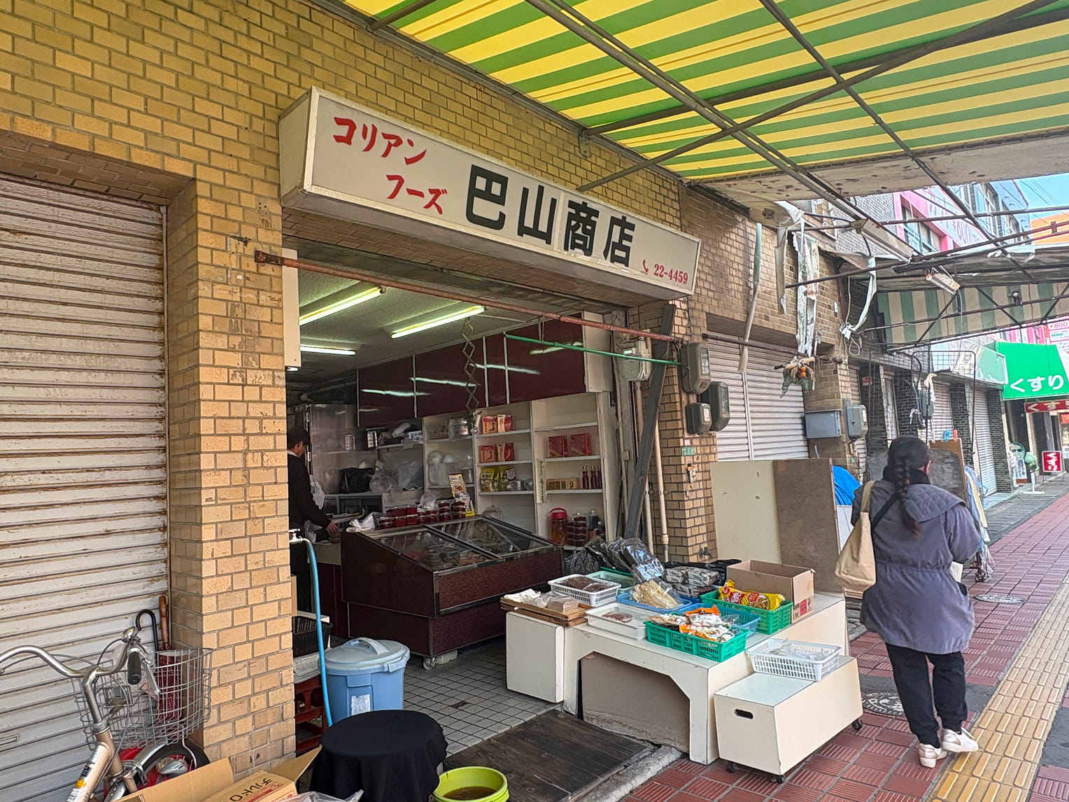 この門から数百メートル、焼肉屋さんや韓国食材店が軒を連ねる「グリーンモール商店街」が続く。といっても、東京の新大久保や大阪の鶴橋のような大規模なコリアンタウンではない。顔なじみのお客さんたちがお店の人とお喋りしながら買い物をしていく、地域の商店街といった雰囲気。ランチ営業の飲食店が少ないのと、年末休みの店舗も多かったのか、この日はけっこうひっそりしていた。戦後の闇市にルーツをもつらしく、昔はもっとにぎやかだったのだろう。