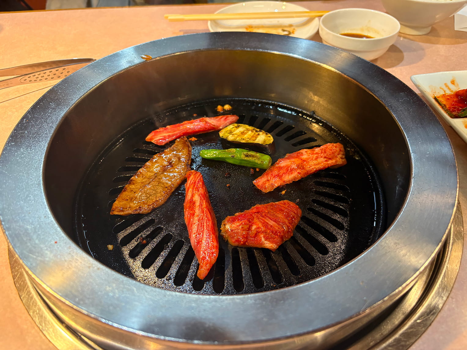 お腹が空いたので、プチ韓国旅の締めくくりは、お昼から営業していた焼肉店〈ソウル〉へ。なんて直球な店名! お肉の味つけが普通、辛口、激辛から選べたので辛口を選んだ。ピリ辛で白米が進む。