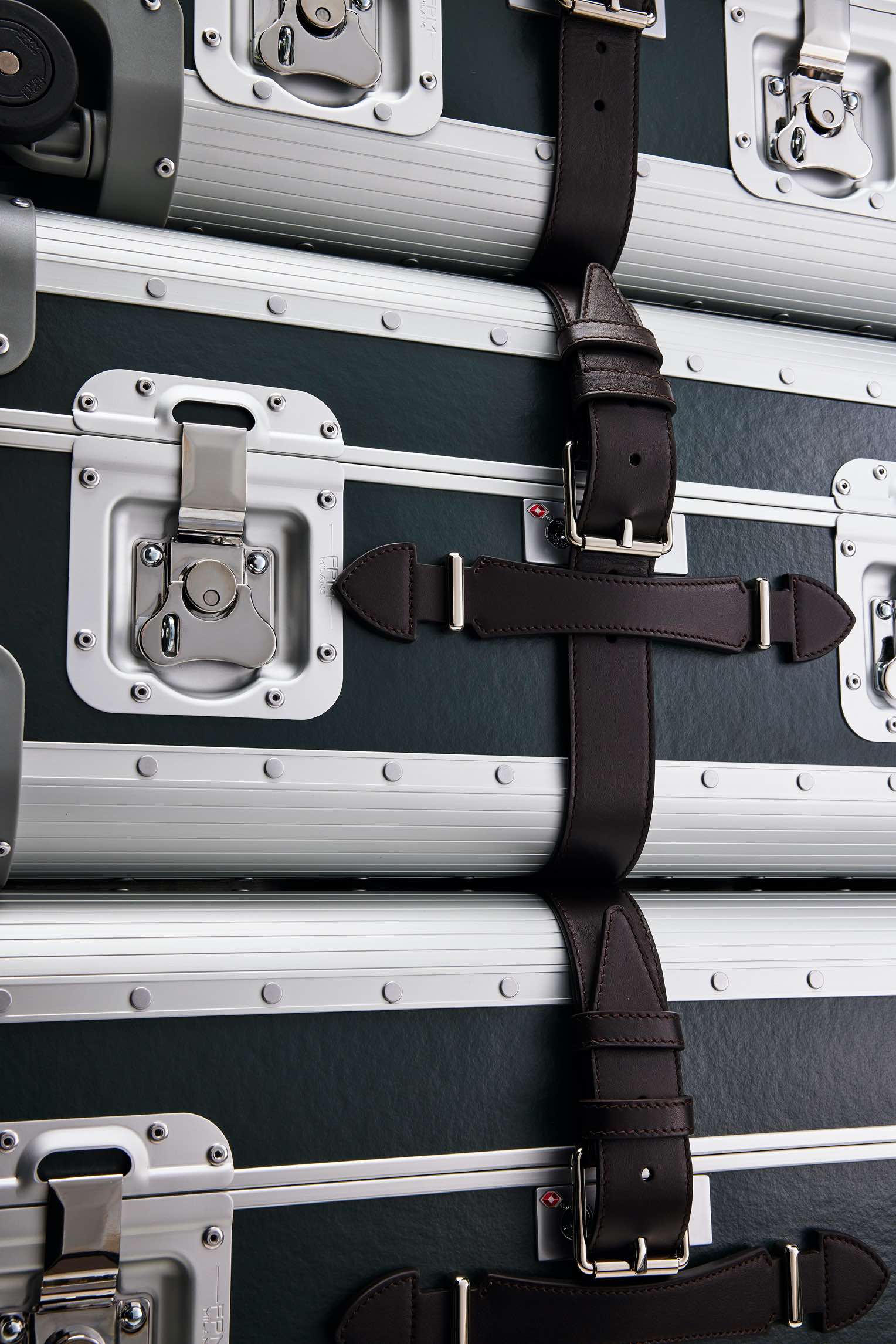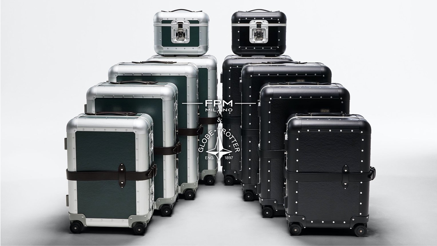 ラインナップは、キャビンサイズからチェックインサイズまでの5サイズ。カラーはオーシャングリーンとブラックの2色で、控えめながら存在感を放つ。FPM Milanoの堅牢なアルミニウム構造に、GLOBE-TROTTERの象徴的なファイバーボードパネルを融合させ、ベルトやハンドルなど細部に両ブランドのアイデンティティをさりげなく取り入れている。